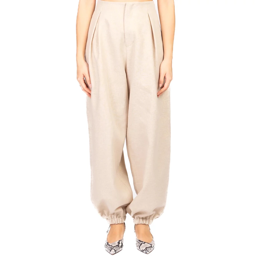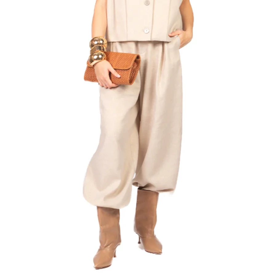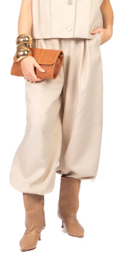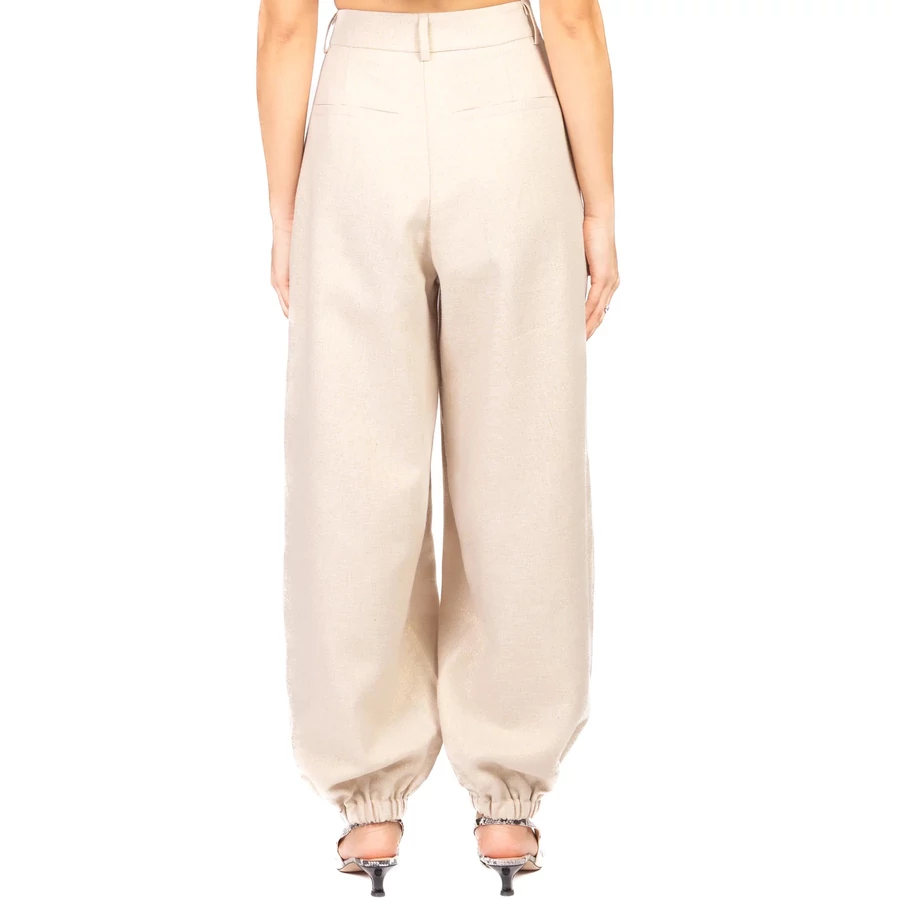 Imperial ballon fazonú női nadrág lenkeverékből készült, finom lurex szállal gazdagítva, amely enyhén csillogó, elegáns hatást biztosít. Gumírozott bokarészével, cipzáras záródásával és praktikus oldalzsebeivel egyszerre kényelmes és stílusos választás. Tökéletes kifinomult, modern megjelenéshez egy kis extra ragyogással.