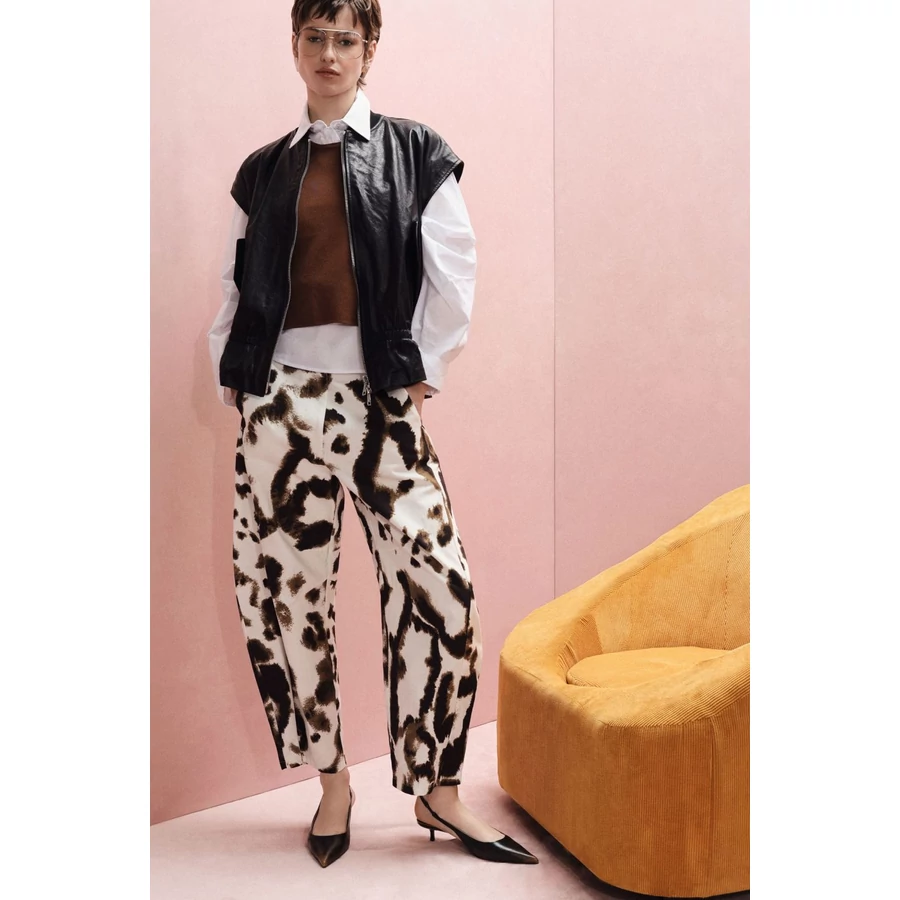 Magas derekú, bő szárú nadrág absztrakt mintával. Laza szabása és diszkrét oldalzsebei sokoldalú kombinációkat tesznek lehetővé. Ideális választás azok számára, akik egyedi, kifejező stílust keresnek a modern ruhatárukba.