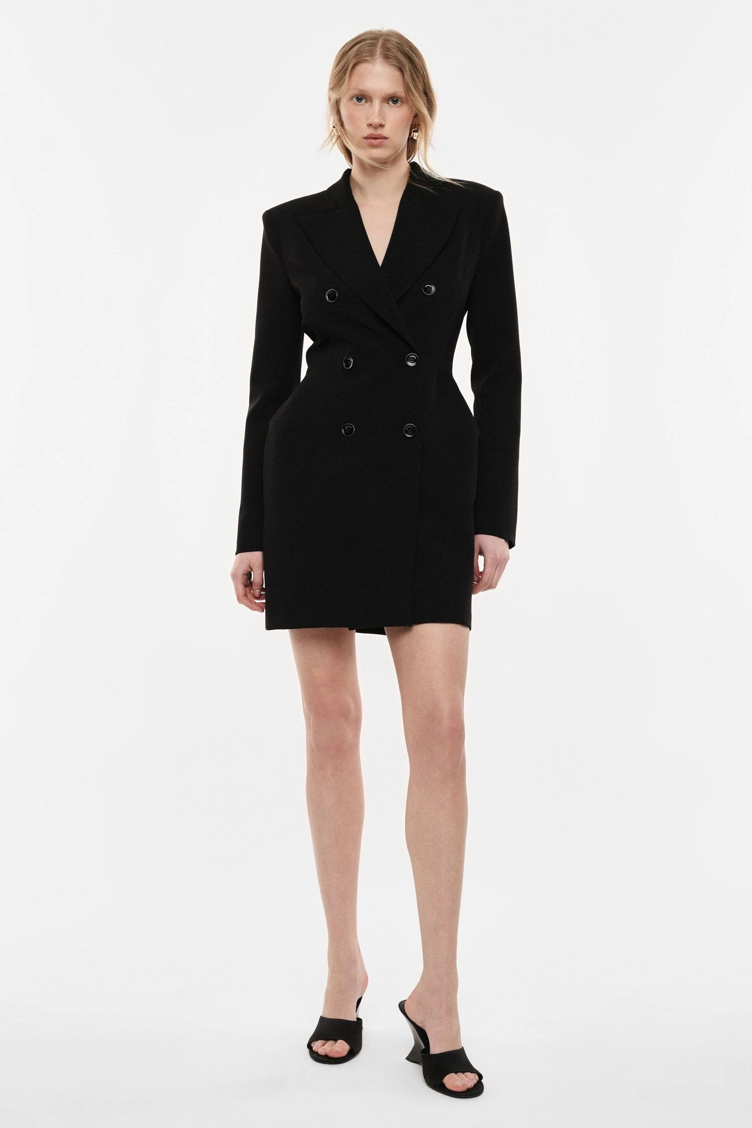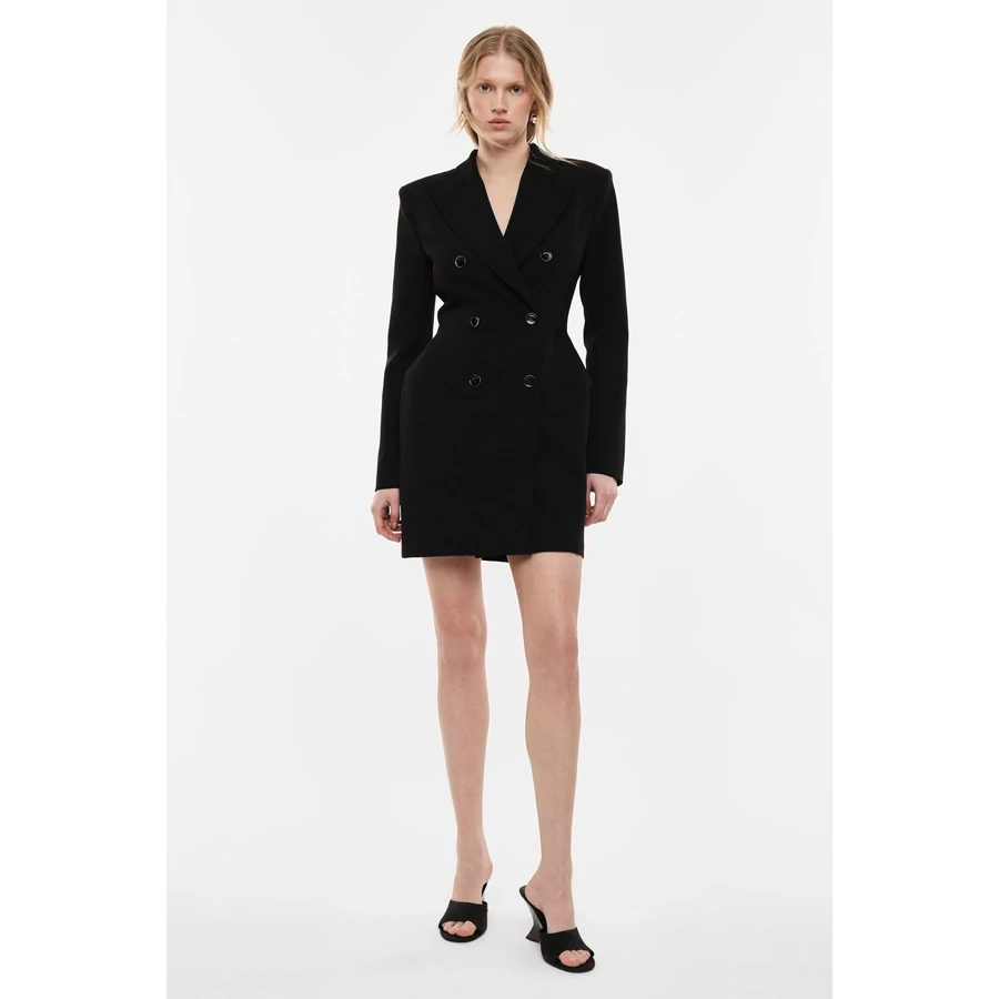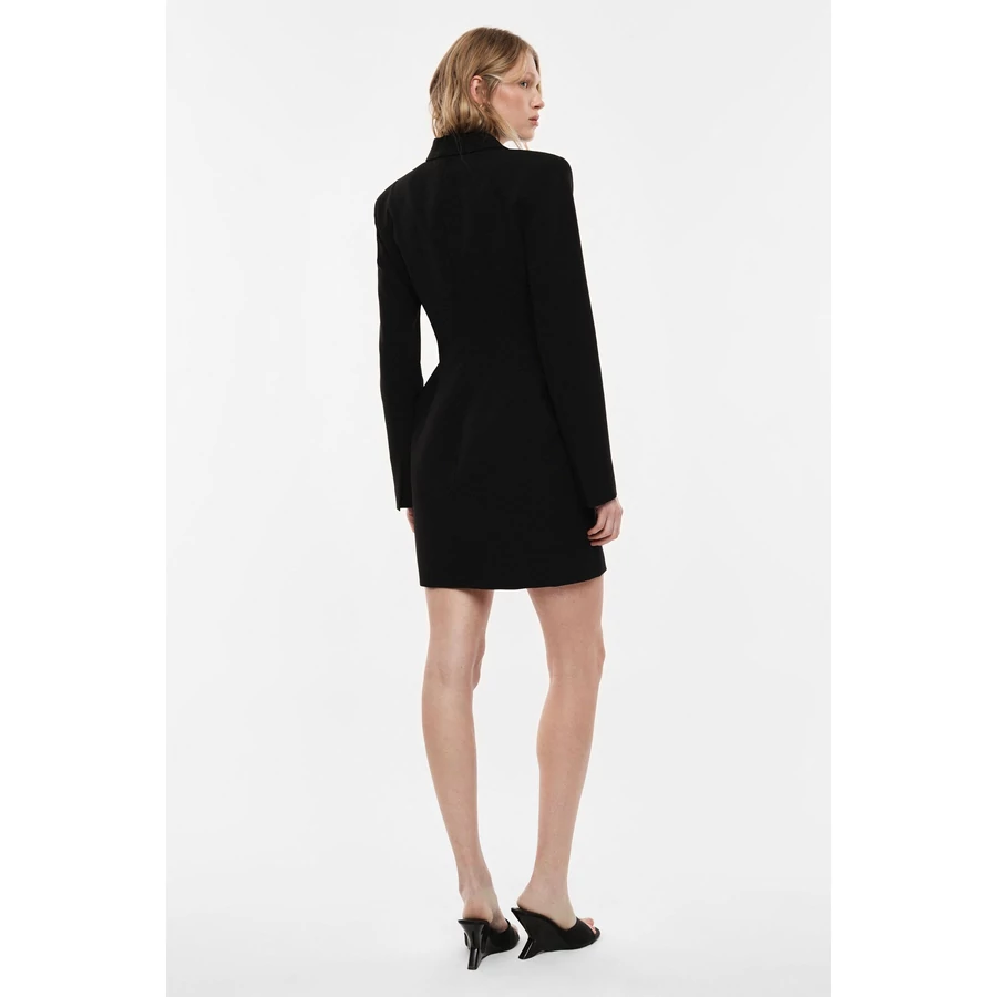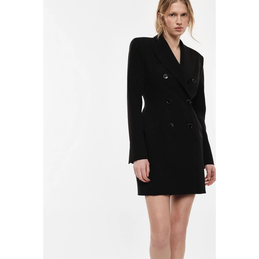 Ez a rövid ruha kétsoros gombolással, hosszú ujjakkal és klasszikus gallérral készült, amely strukturált megjelenést és elegáns karaktert kölcsönöz. A szabott sziluett modern értelmezésben gondolja újra a formális öltözködést. Kifinomult választás a kortárs ruhatárhoz, amely stílusos és sokoldalú megjelenést biztosít a városi mindennapokhoz.
