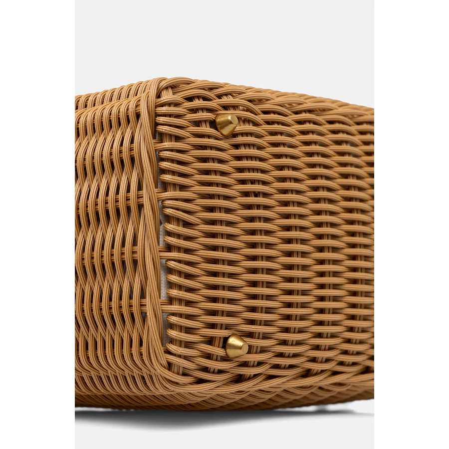 Nyárias hangulatú Liu Jo kézitáska, amely természetes hatású fonott kialakításával azonnal magára vonja a figyelmet. A bambusz hatású fülek és az elegáns részletek különleges, trendi megjelenést biztosítanak. Tökéletes választás nyaraláshoz, városi sétákhoz vagy könnyed nyári outfitekhez.