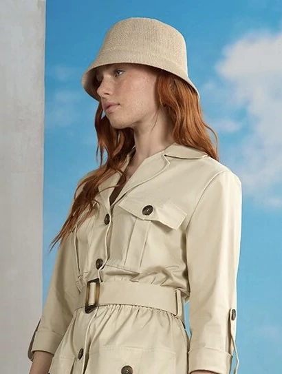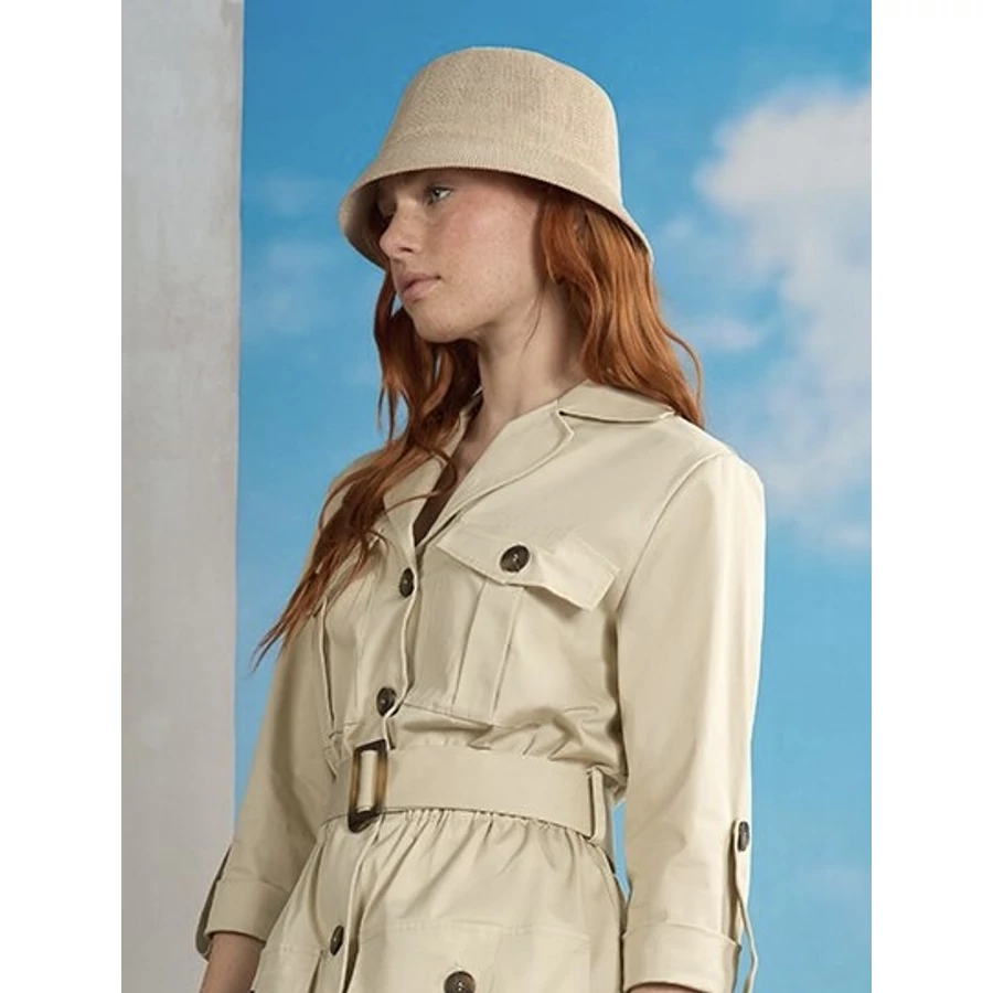 Bézs női kalap finom ívű karimával, letisztult dizájnnal. Kifinomult megjelenést ad, ideális választás elegáns és divatos városi viseletekhez.