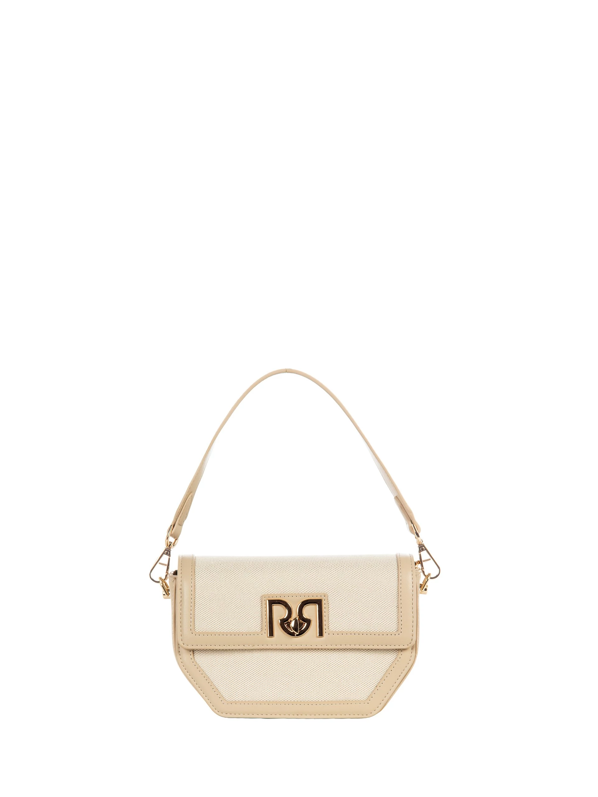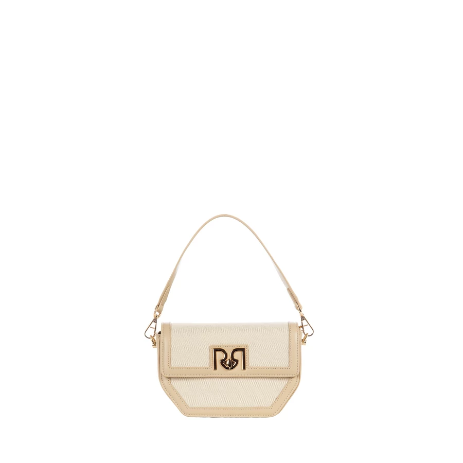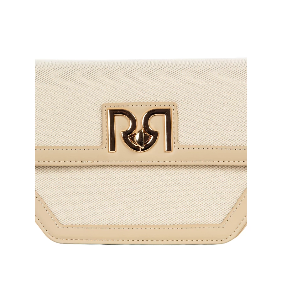Kompakt méretű, világos színű női táska elegáns fém logóval, amely stílusos és praktikus kiegészítő a mindennapokra. Kis mérete ellenére jól rendszerezhető belsőt kínál.