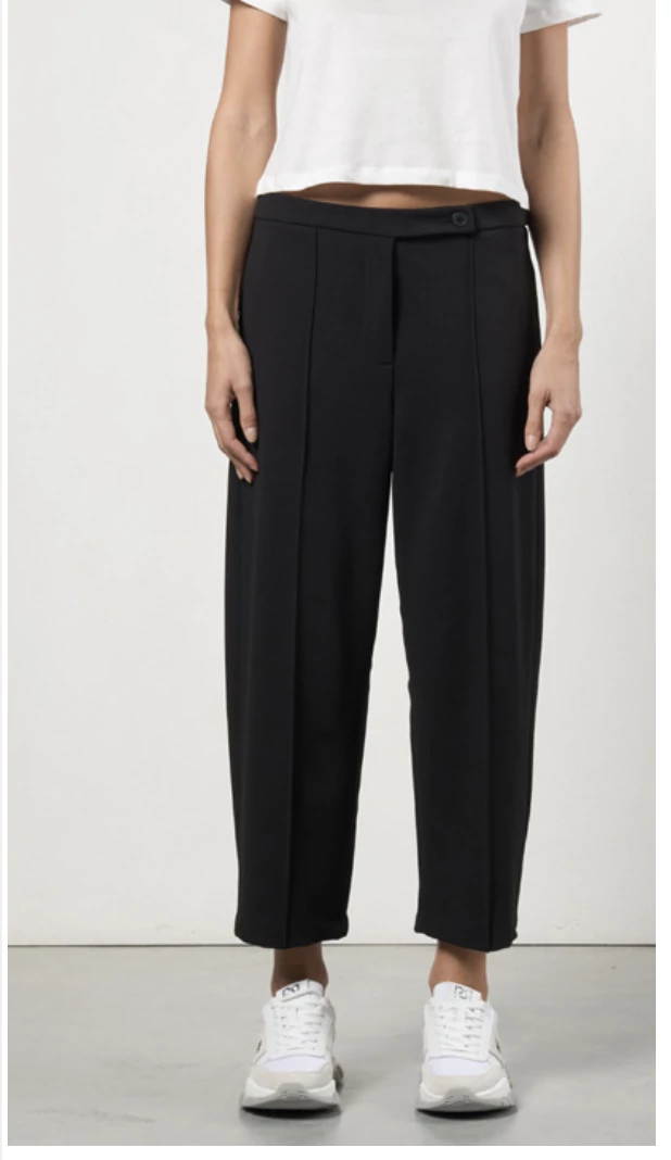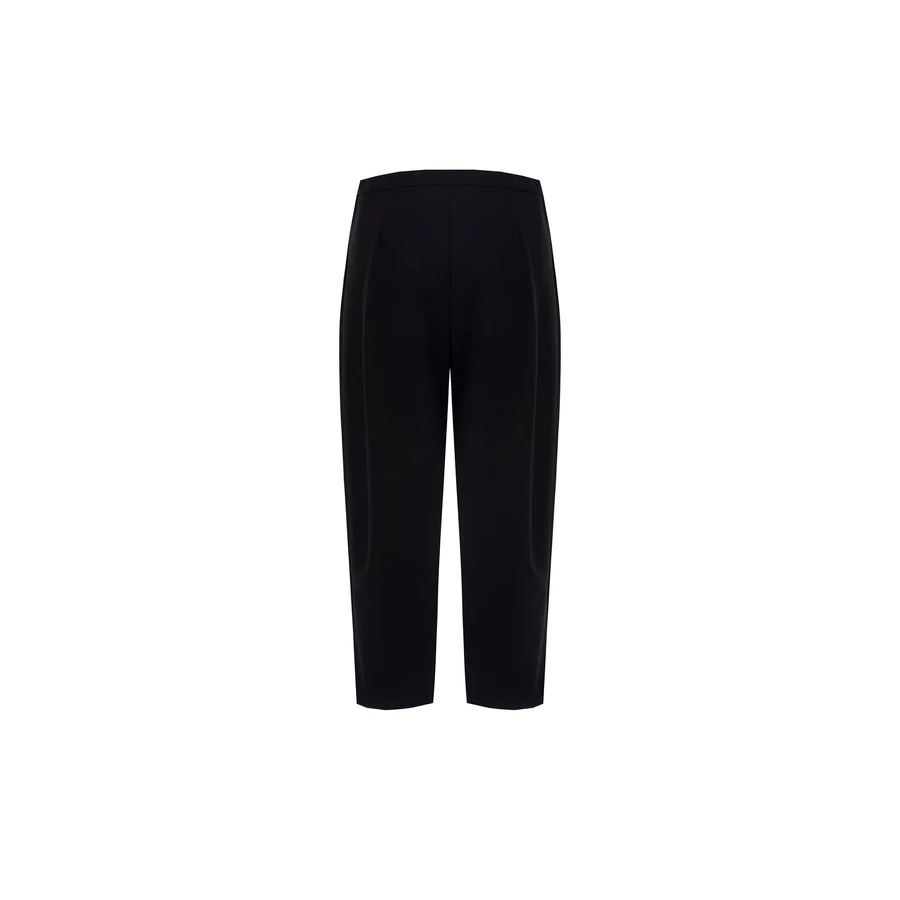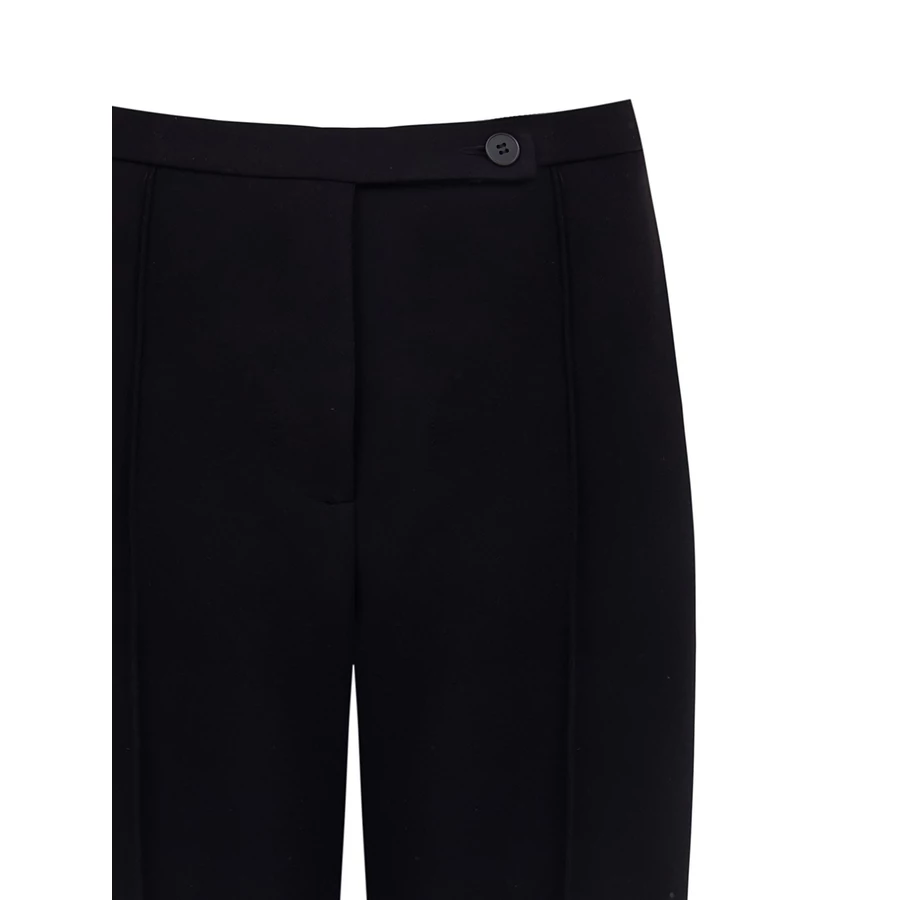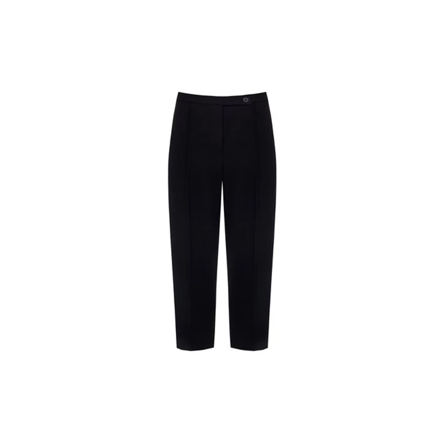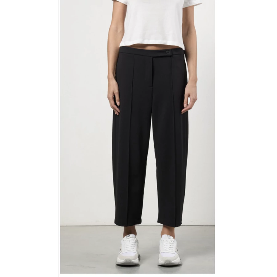 Fekete, klasszikus szabású női nadrág bokáig érő fazonnal. Letisztult megjelenése miatt alapdarab az elegáns ruhatárban. Tökéletes választás irodai viselethez, alkalmi eseményekhez vagy stílusos hétköznapi megjelenéshez.
