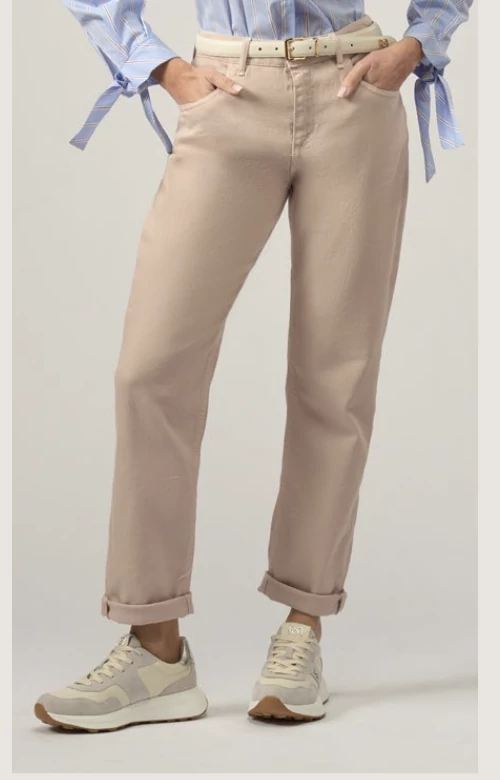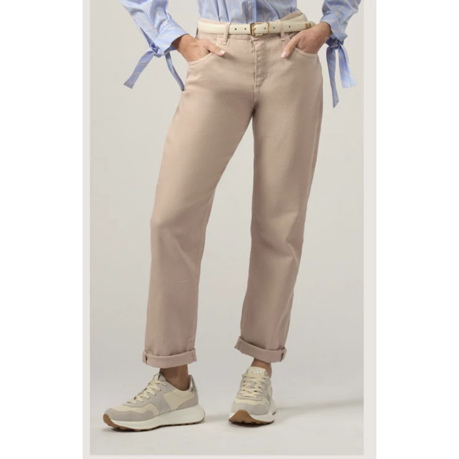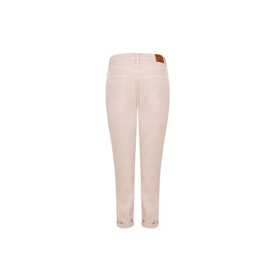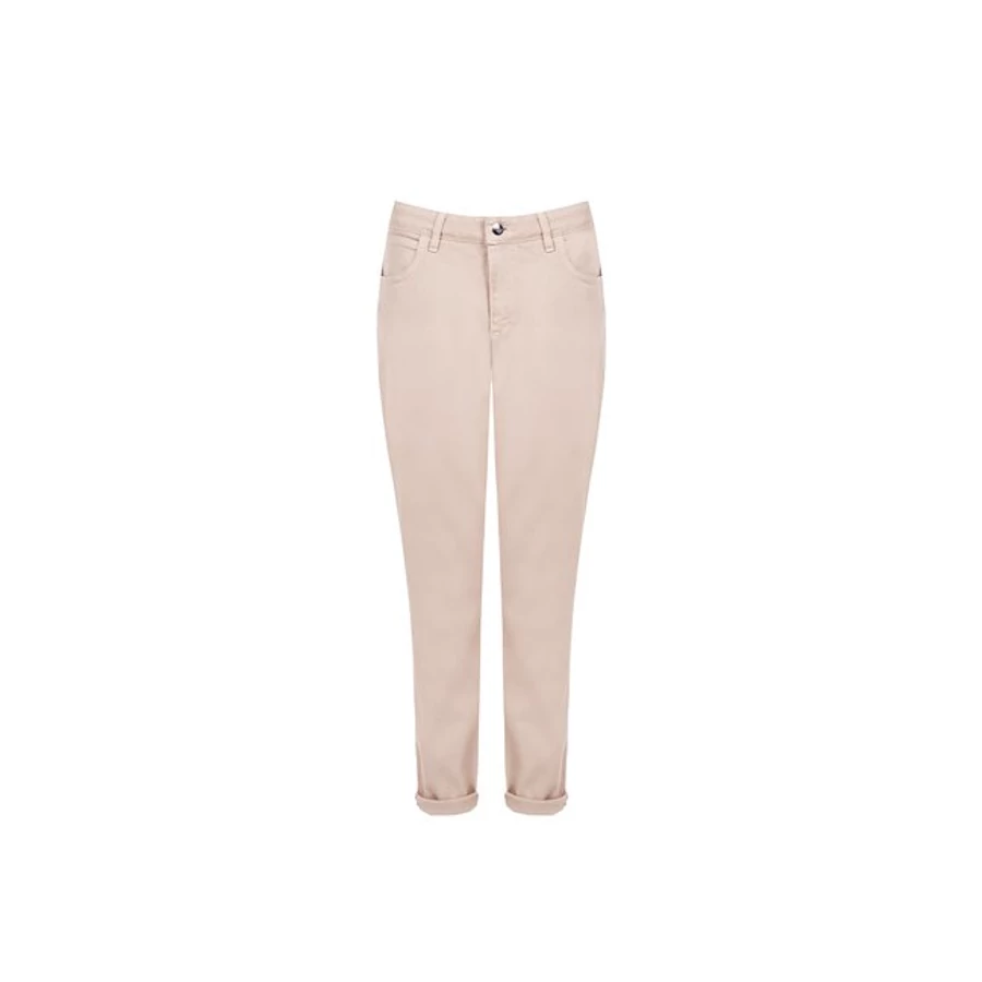 Bézs árnyalatú női nadrág letisztult, egyenes szabással. Elegáns és sokoldalú darab, amely irodai viselethez és stílusos hétköznapi megjelenéshez is ideális.