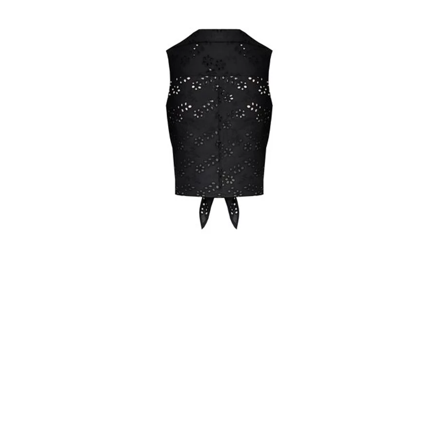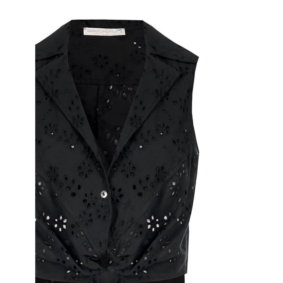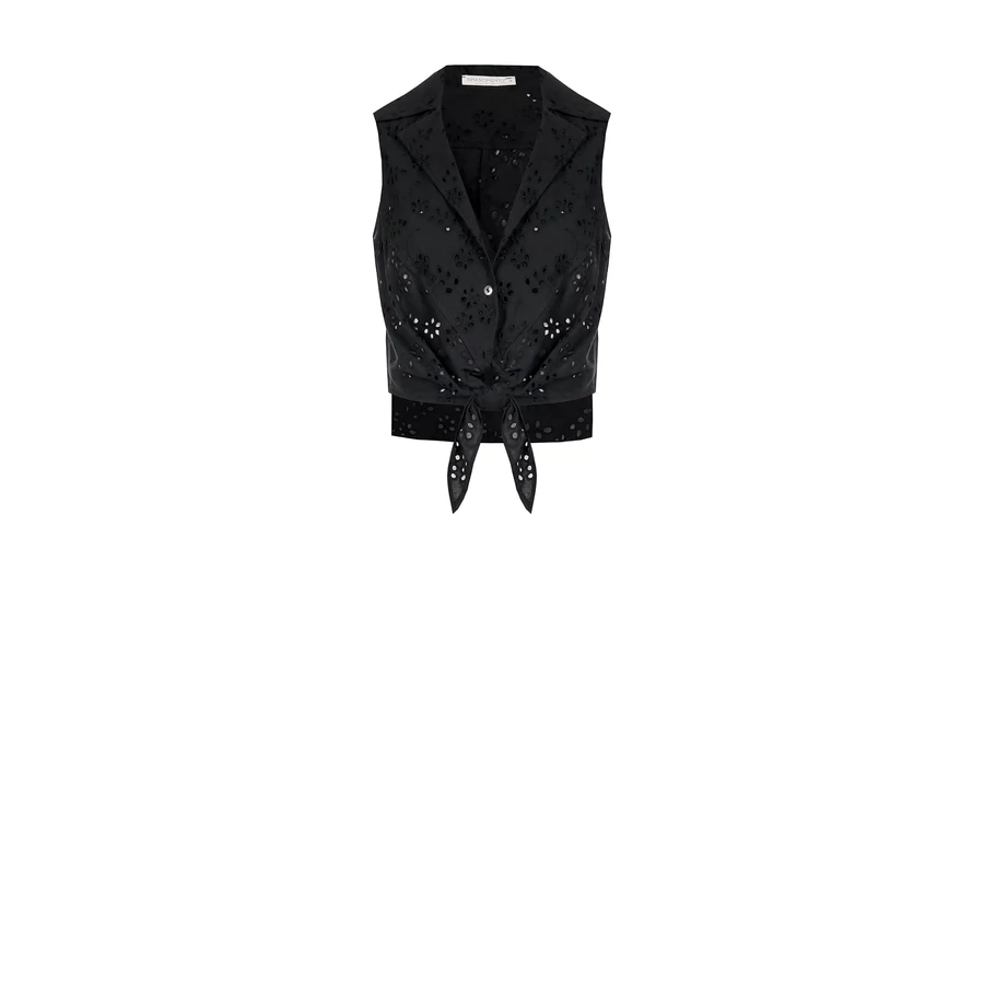 A Rinascimento fekete, ujjatlan felső különleges, áttört mintázatával és megkötős kialakításával igazán egyedi darab. A galléros fazon elegáns hatást kelt, míg a könnyed anyag és a nőies szabás tökéletes választássá teszi nyári outfitekhez.