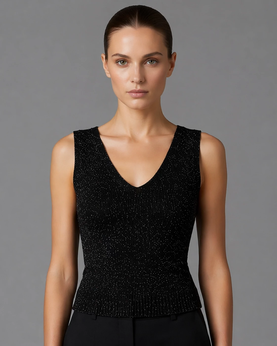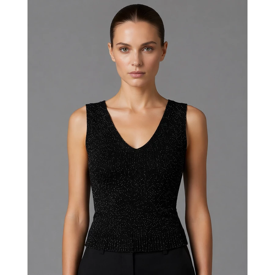 A Rinascimento fekete, finoman csillogó ujjatlan felső elegáns és nőies választás alkalmi és hétköznapi szettekhez is. A V-kivágás és a testhez simuló szabás kiemeli az alakot, míg a különleges, enyhén fényes anyag igazán kifinomult megjelenést biztosít.