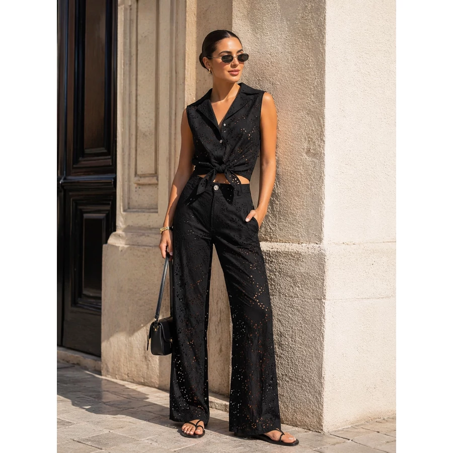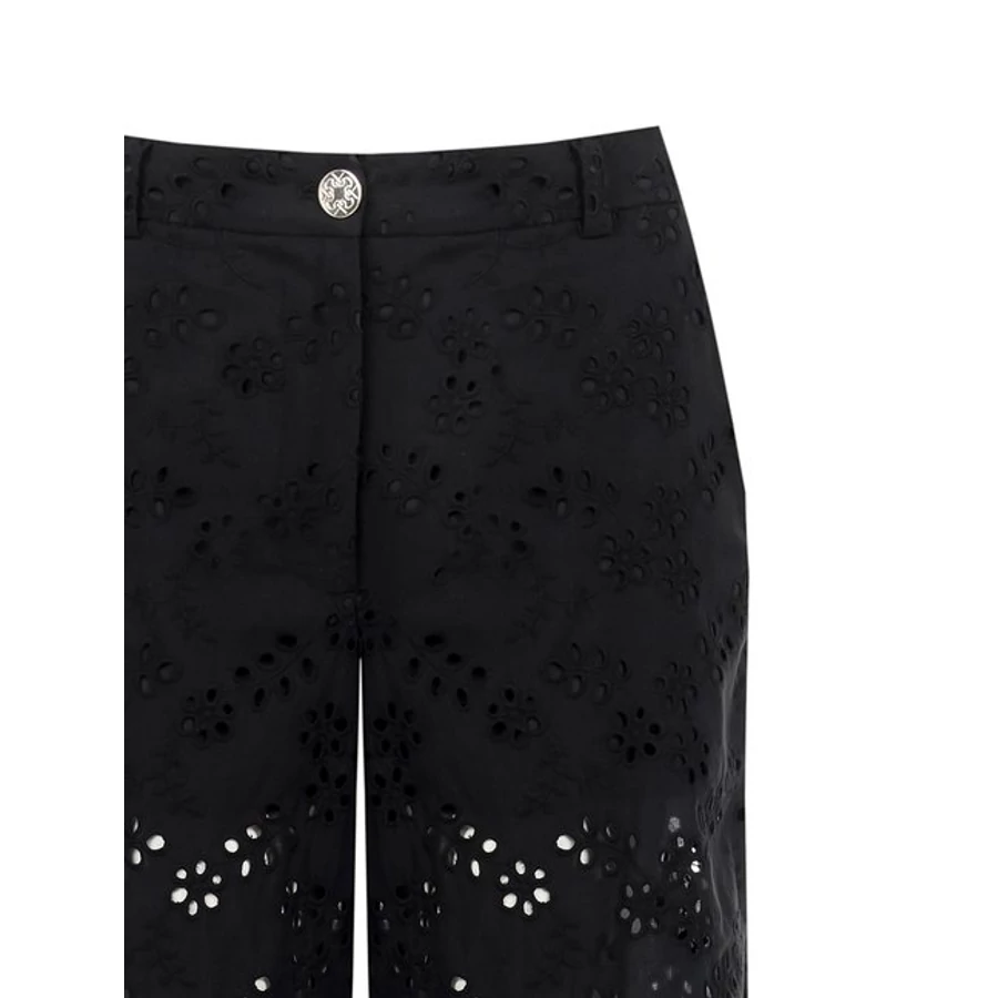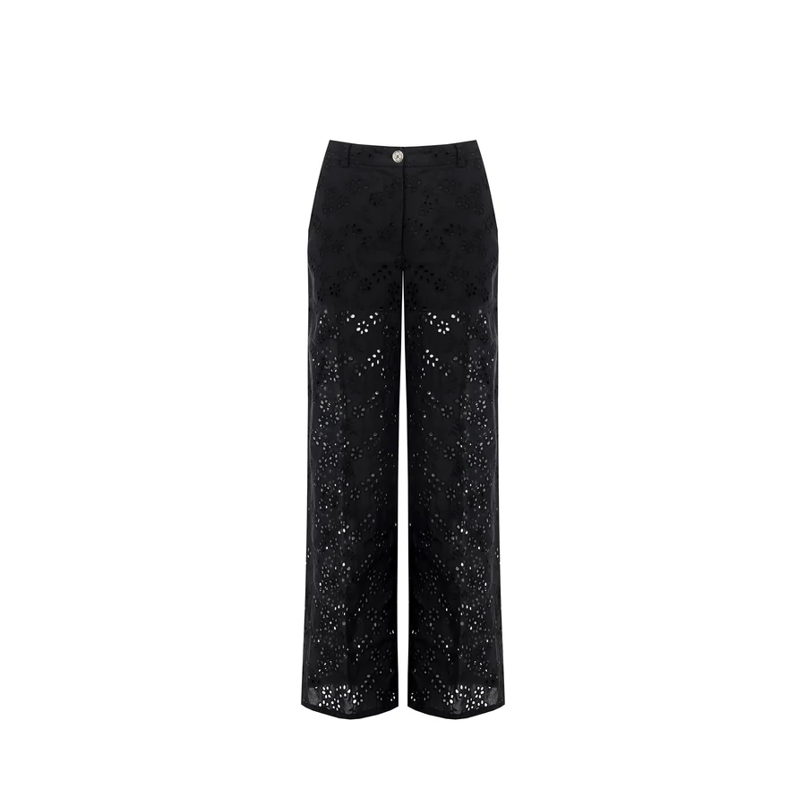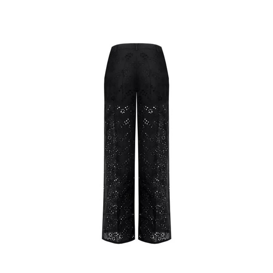 A Rinascimento fekete nadrág különleges, áttört mintázatával és elegáns szabásával igazán figyelemfelkeltő darab. A magasított derék és az egyenes szár nőies, kifinomult megjelenést biztosít, míg a könnyed anyag ideális választás a melegebb napokra.