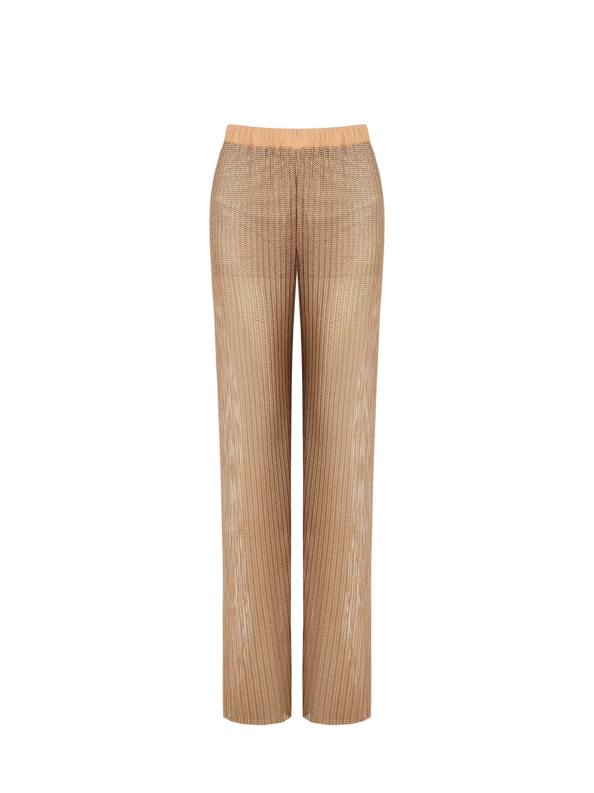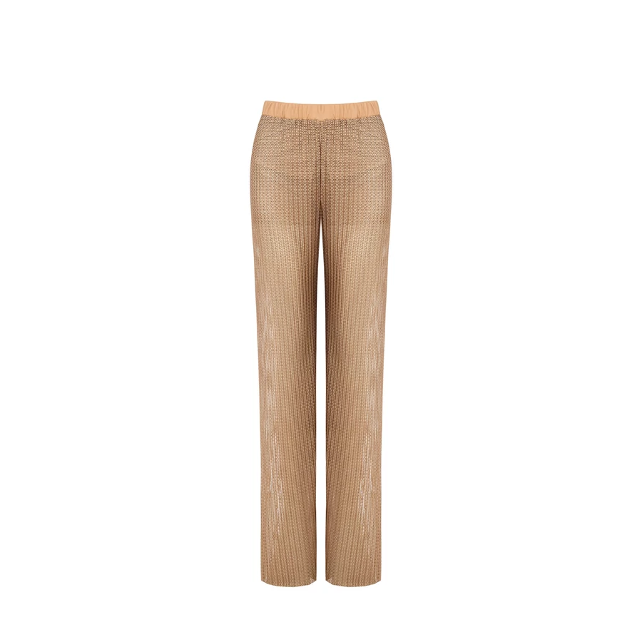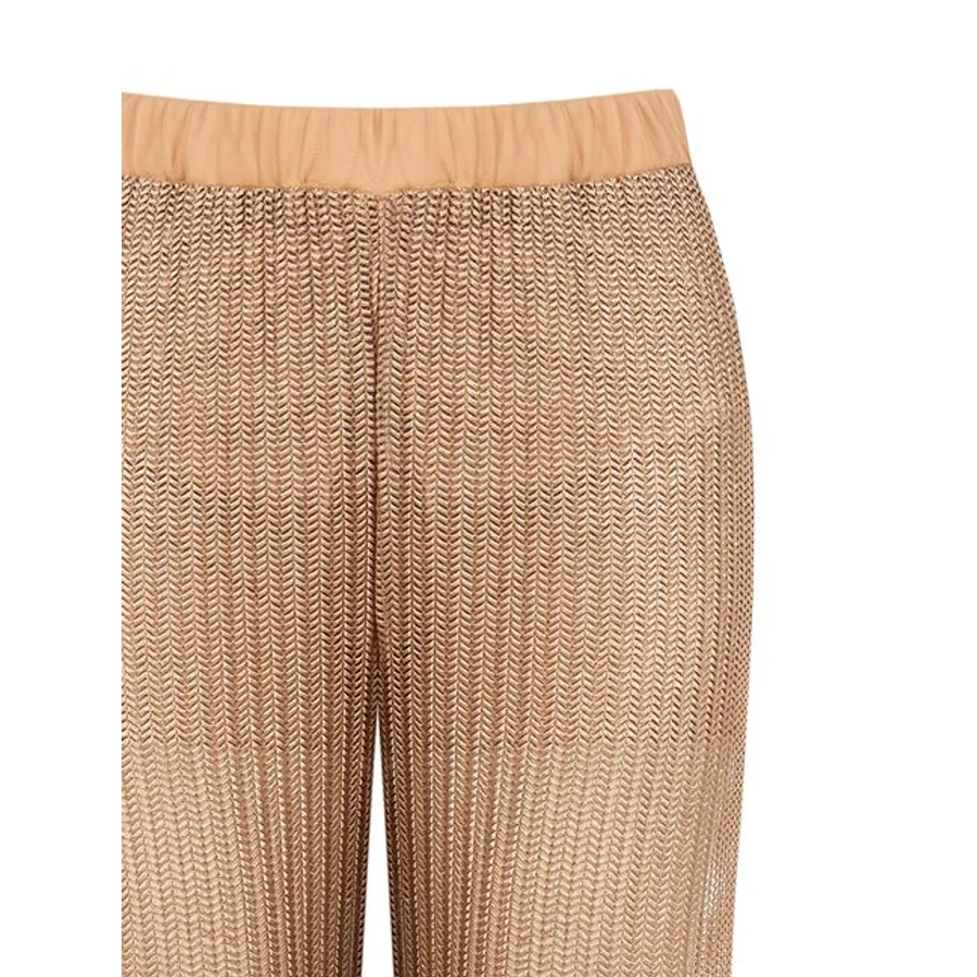 A Rinascimento nadrág egyenes szárú fazonjával és rugalmas derékrészével kényelmes, mégis kifinomult megjelenést biztosít. Az arany tónusú, matt hatású anyag elegáns, de nem túl hivalkodó, így tökéletes választás hétköznapokra vagy nyaraláshoz. A hozzá illő felsővel szettben viselve harmonikus, modern outfitet alkot.