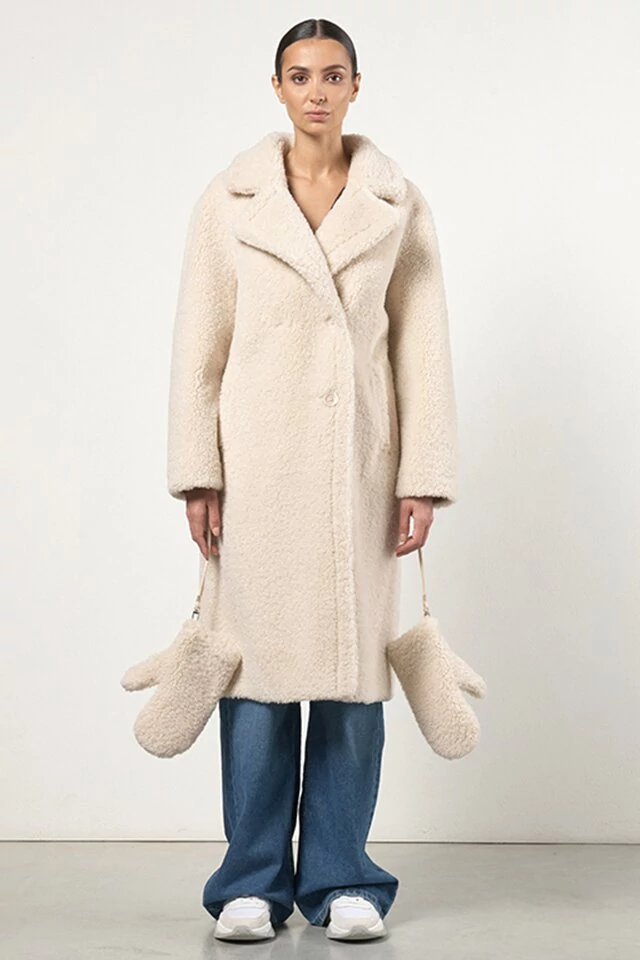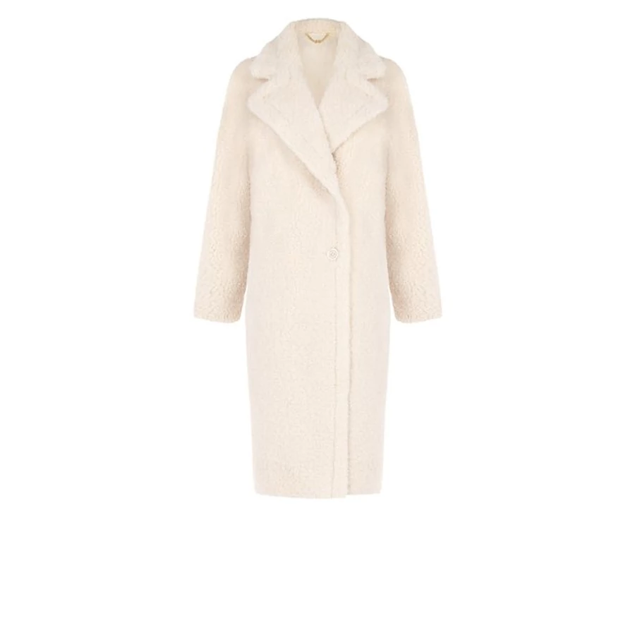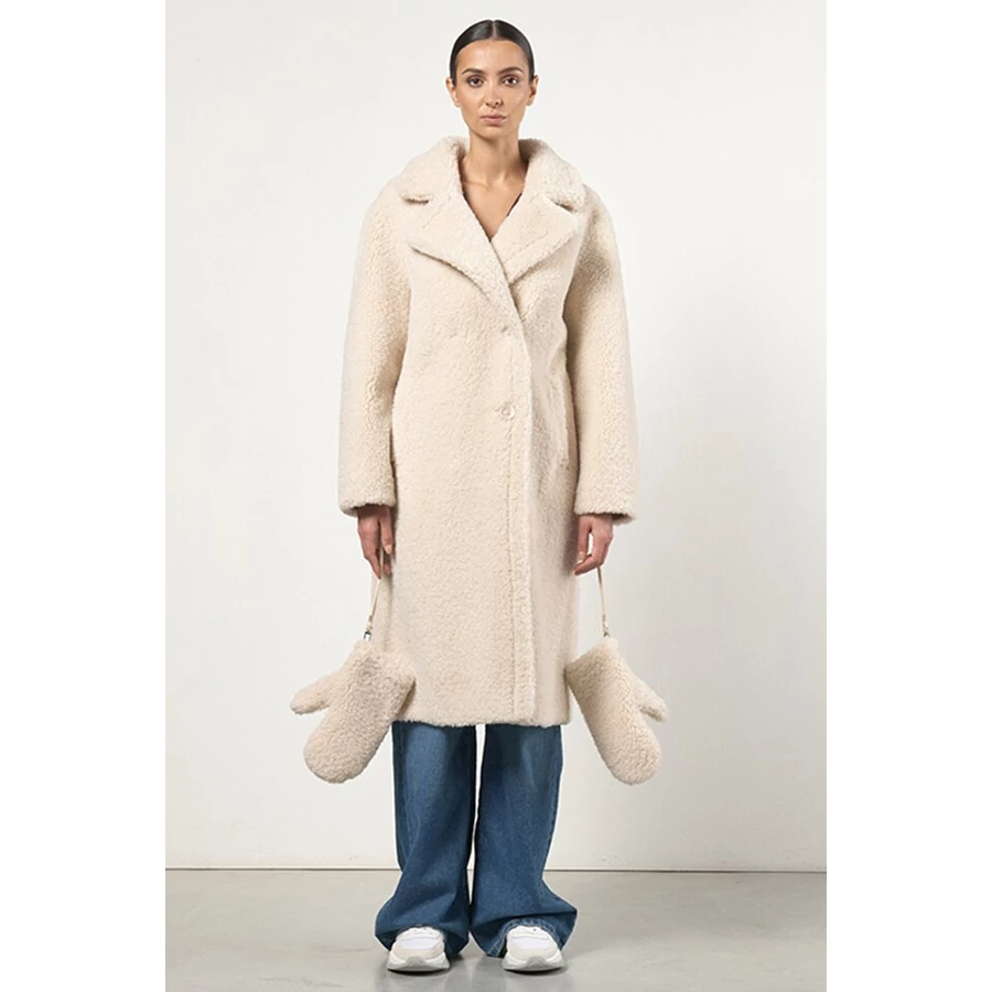 Bézs színű teddy kabát puha, bundás hatású anyagból. Klasszikus fazon, térdig érő hossz, elegáns és hétköznapi viselethez egyaránt ideális. Tökéletes választás irodai viselethez, alkalmi eseményekhez vagy stílusos hétköznapi megjelenéshez.