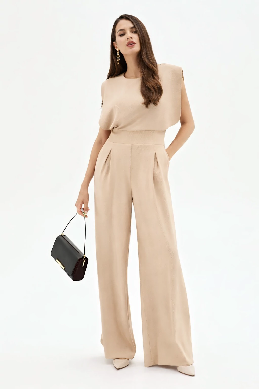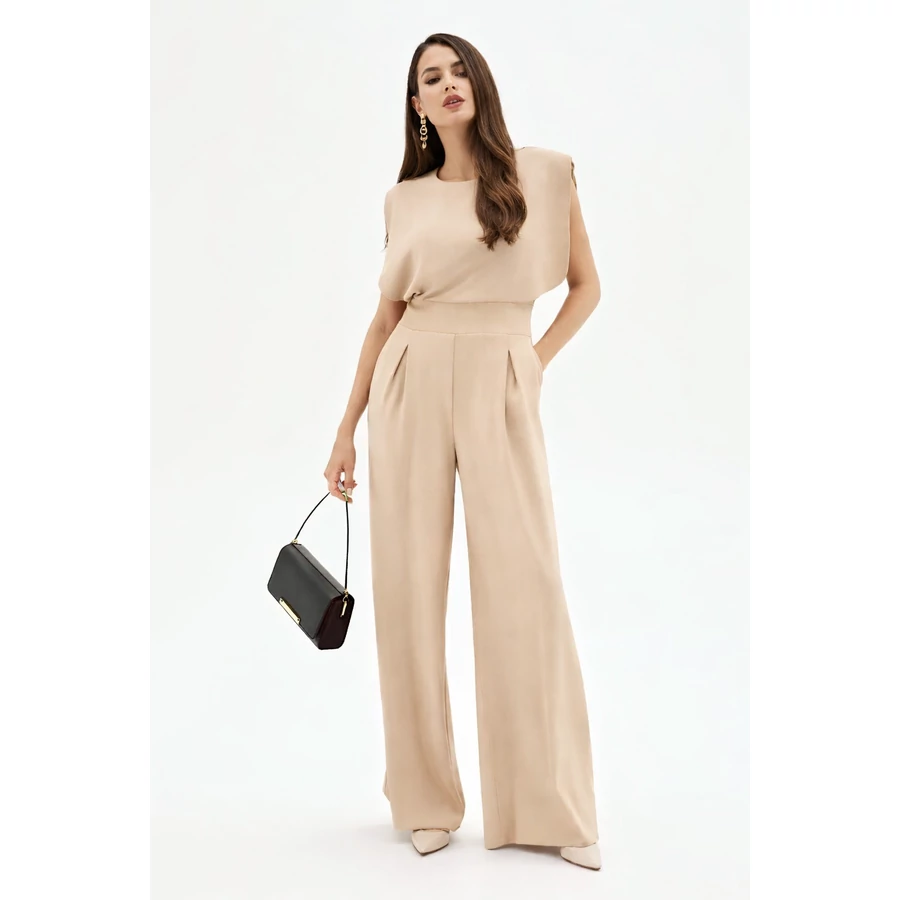 Bézs, ujjatlan overál széles szárú nadrágrésszel. Modern, friss megjelenésű darab, amely nyári rendezvényekhez vagy elegáns nappali viselethez ideális. Tökéletes választás irodai viselethez, alkalmi eseményekhez vagy stílusos hétköznapi megjelenéshez.