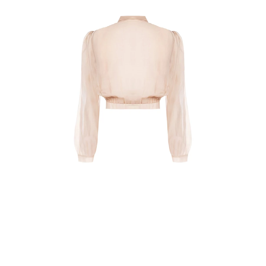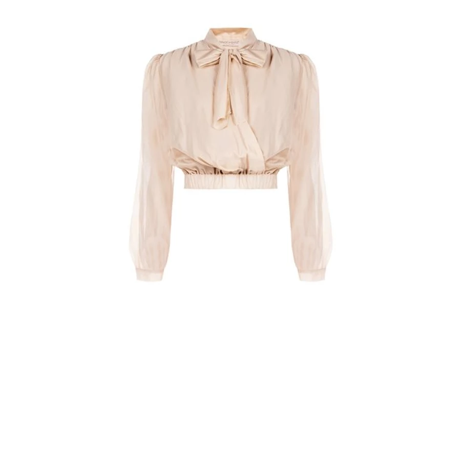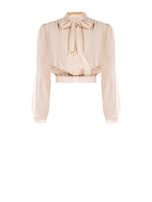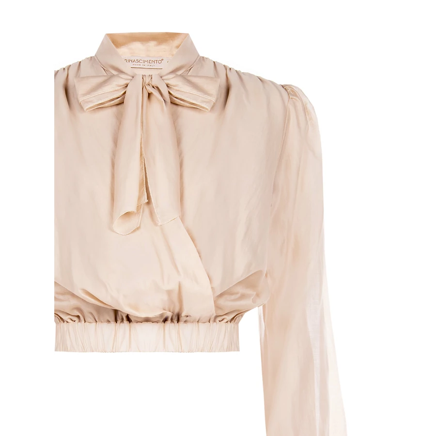 Finom anyagú, világos bézs női blúz masnival, amely romantikus és elegáns megjelenést kölcsönöz. Tökéletes választás alkalmi és irodai viselethez is.