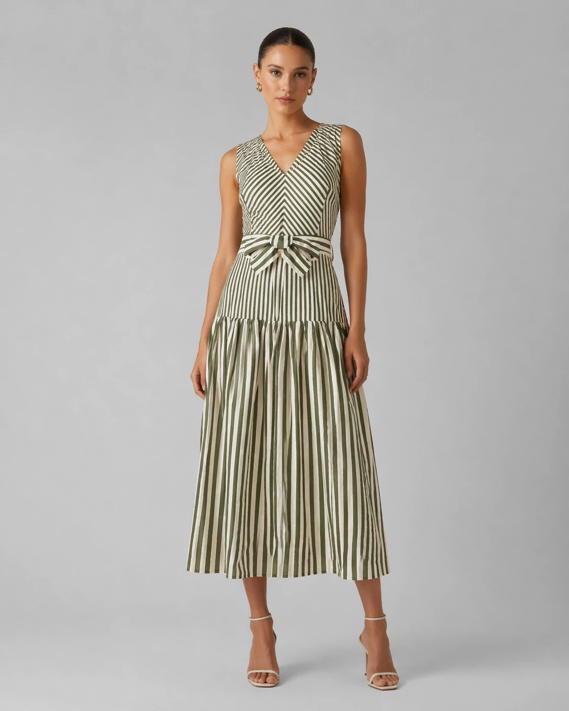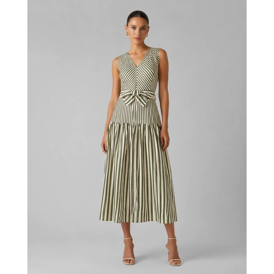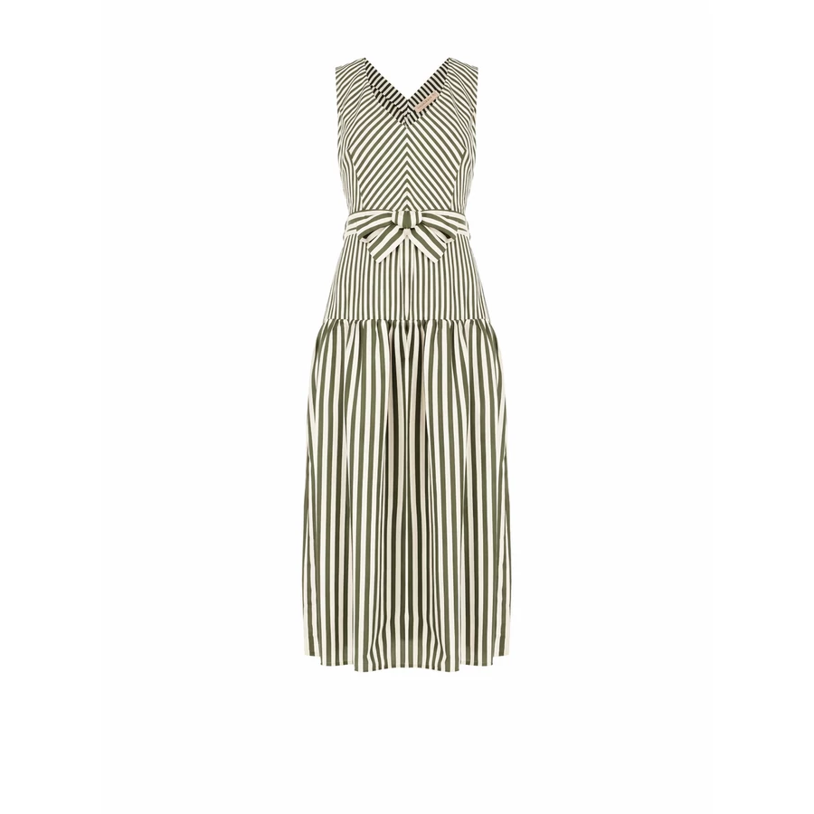 A Rinascimento khaki–fehér csíkos ruha friss, nyári megjelenést biztosít elegáns, mégis könnyed stílusban. A V-nyakkivágás, a deréknál megkötős részlet és a lágy esésű szoknyarész nőies sziluettet alkot, míg a csíkos minta optikailag nyújtja az alakot.