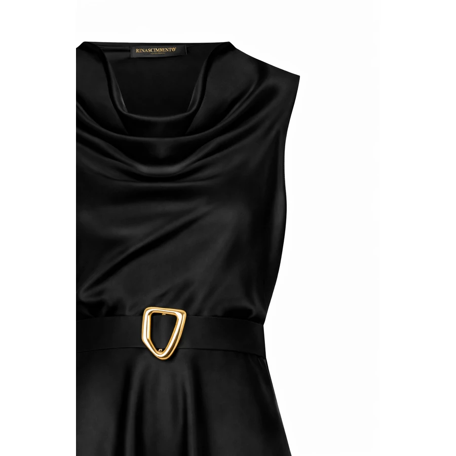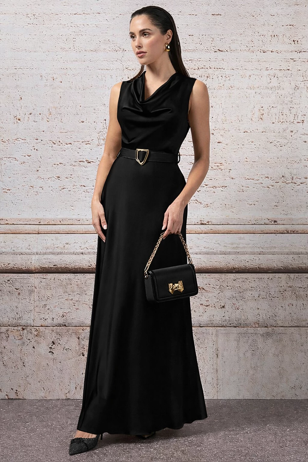 Fekete árnyalatú, földig érő női ruha lágy esésű anyagból. Derékban öves kialakítása nőies sziluettet ad, alkalmas esküvőkre és elegáns eseményekre. Tökéletes választás irodai viselethez, alkalmi eseményekhez vagy stílusos hétköznapi megjelenéshez.