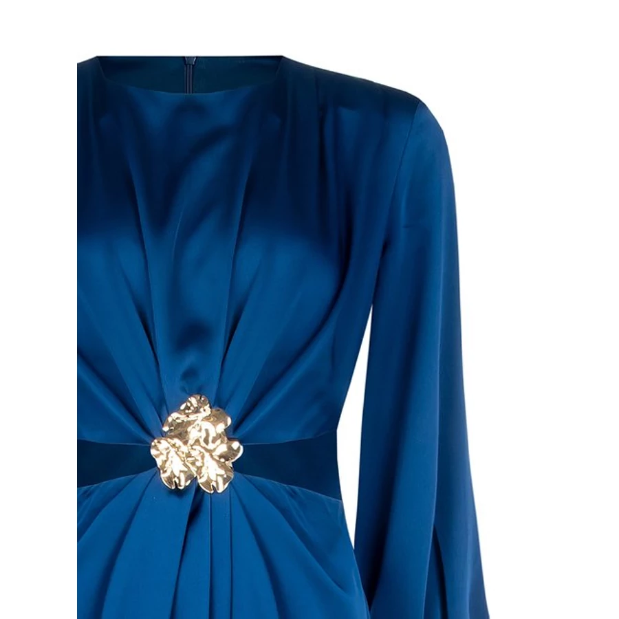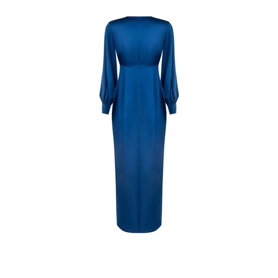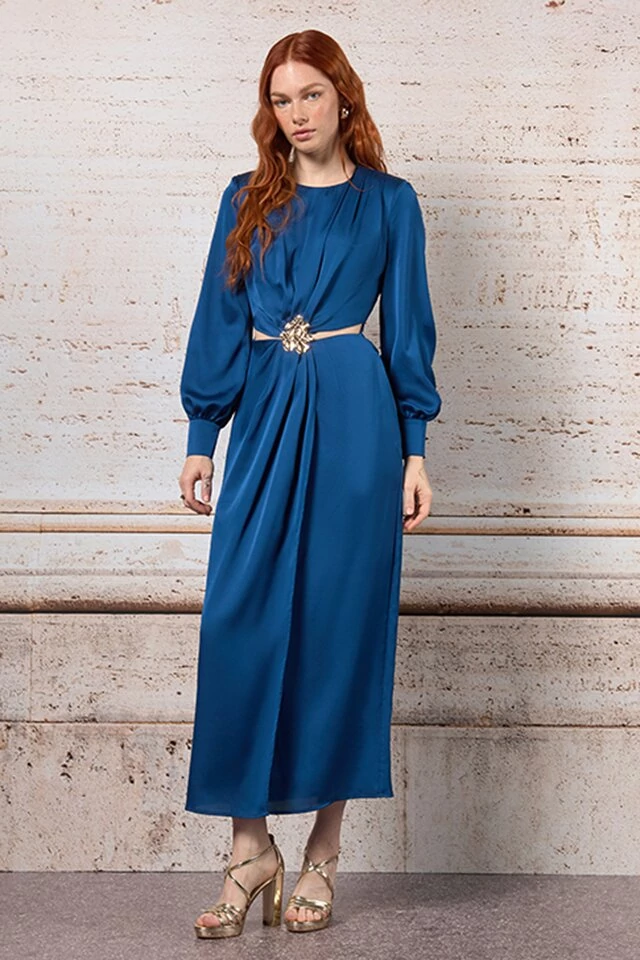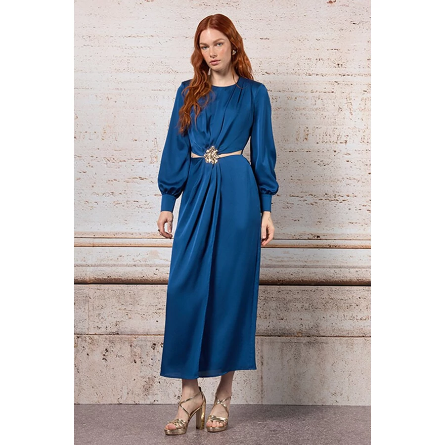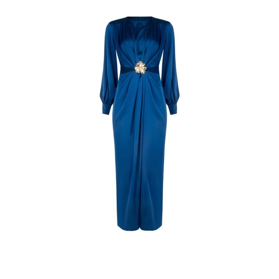 Kék, hosszú ujjú estélyi ruha, hangsúlyos derékrésszel és dekoratív díszítéssel. Elegáns választás alkalmi eseményekre és ünnepi megjelenésekhez. Tökéletes választás irodai viselethez, alkalmi eseményekhez vagy stílusos hétköznapi megjelenéshez.