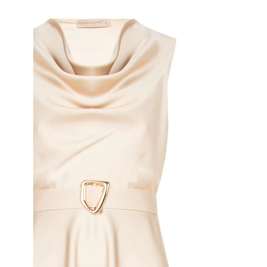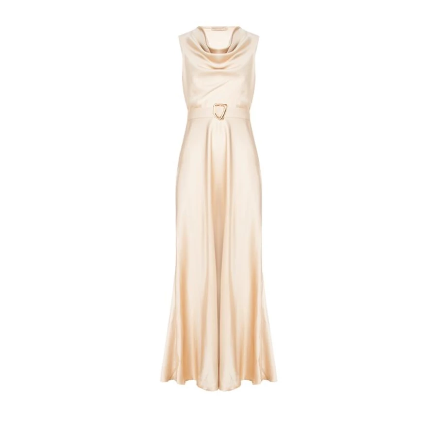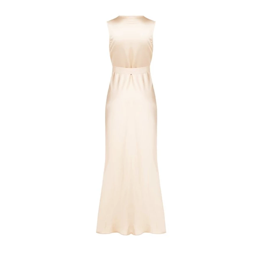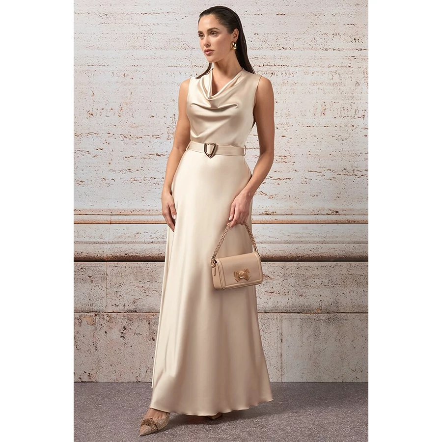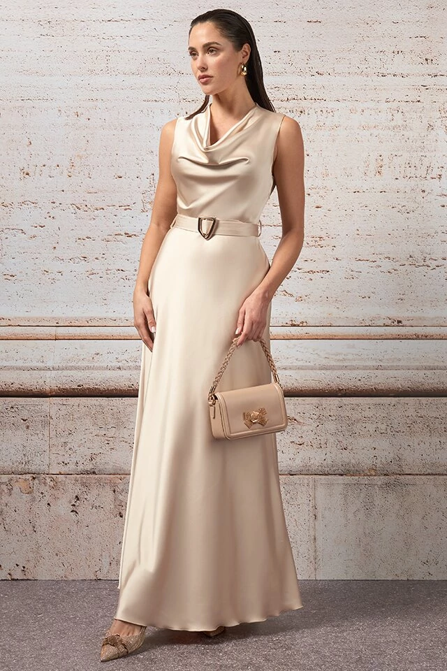 Bézs árnyalatú, földig érő női ruha lágy esésű anyagból. Derékban öves kialakítása nőies sziluettet ad, alkalmas esküvőkre és elegáns eseményekre. Tökéletes választás irodai viselethez, alkalmi eseményekhez vagy stílusos hétköznapi megjelenéshez.