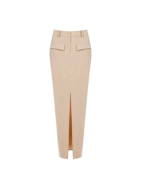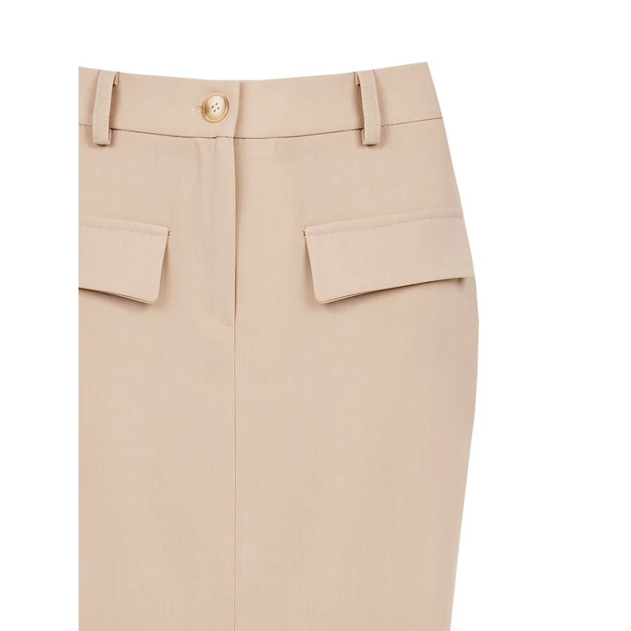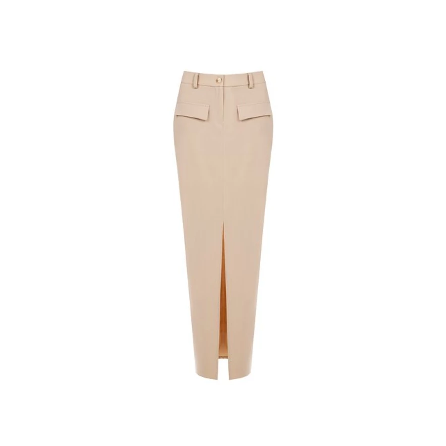 Bézs árnyalatú női szoknya elöl hasítékkal, amely nőies és elegáns megjelenést kölcsönöz. Karcsúsított fazonja tökéletes választás irodai és alkalmi viselethez.