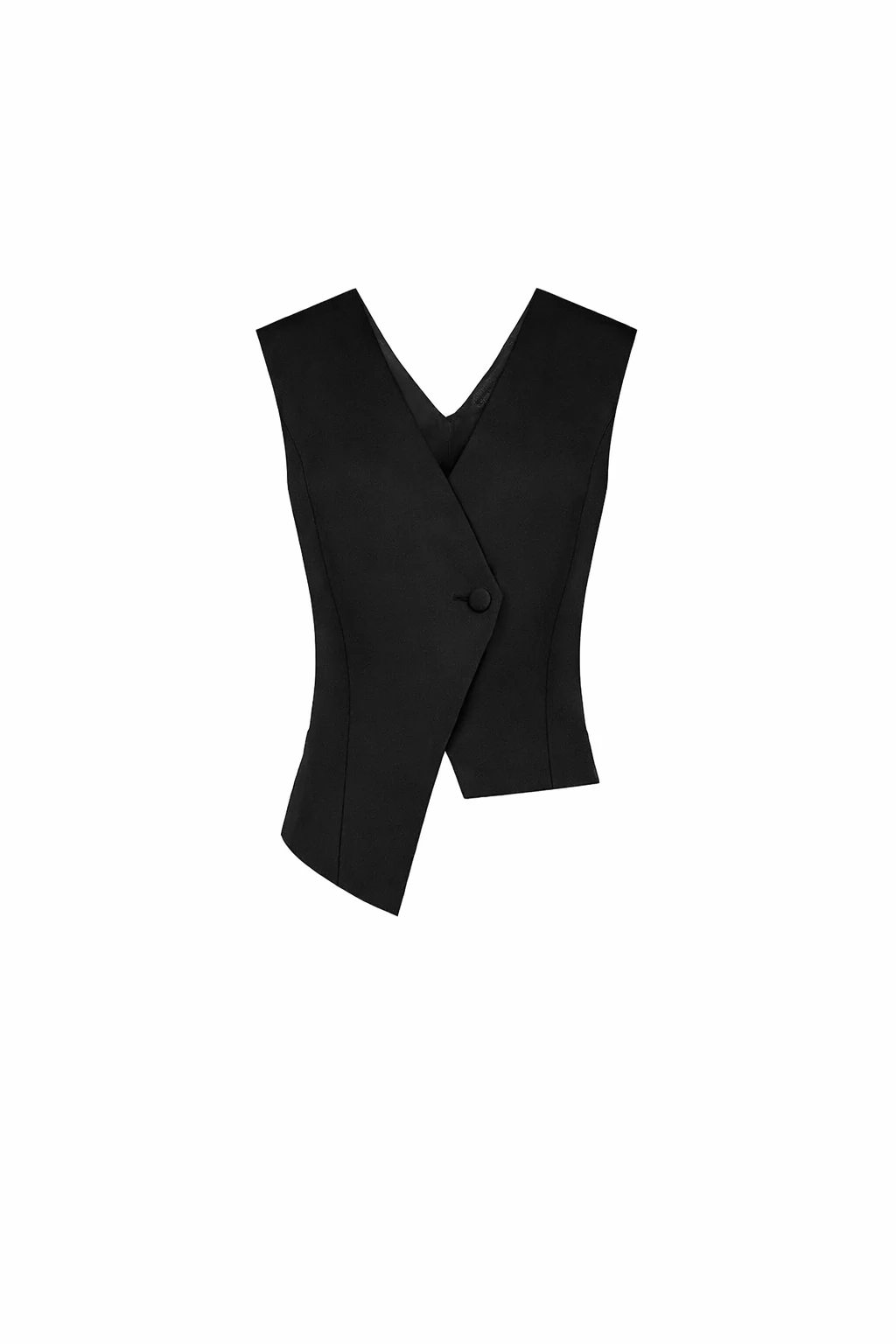 Letisztult fekete ujjatlan női mellény modern, aszimmetrikus szabással, amely stílusos kiegészítője az elegáns és üzleti szetteknek. Különleges fazonja egyedi megjelenést kölcsönöz.