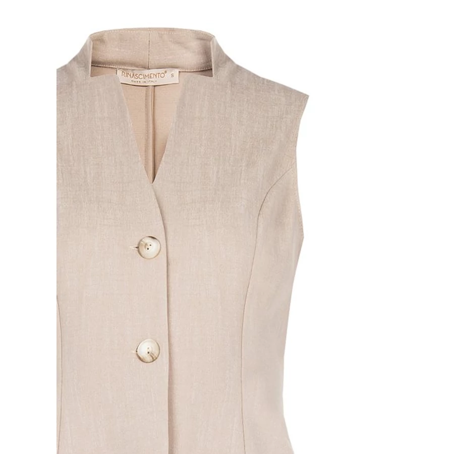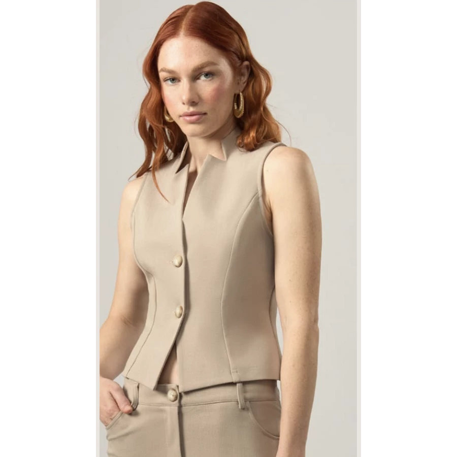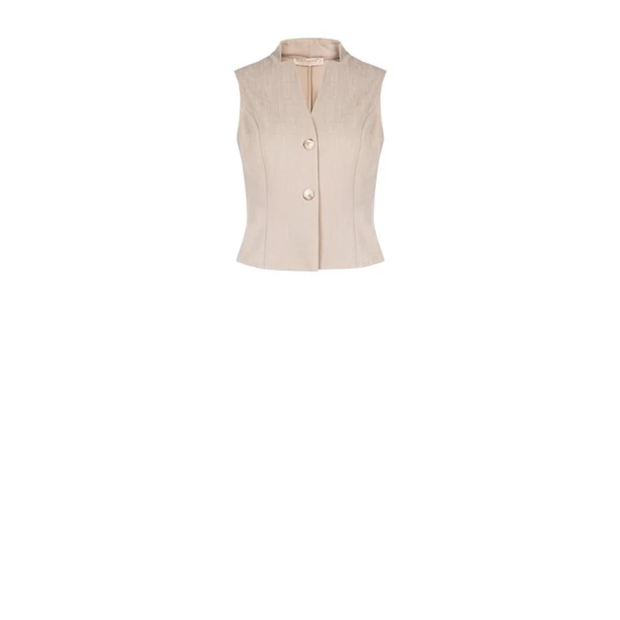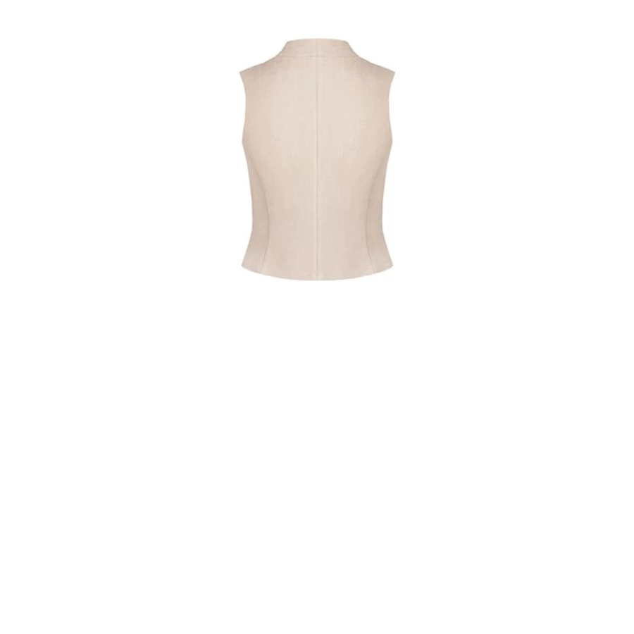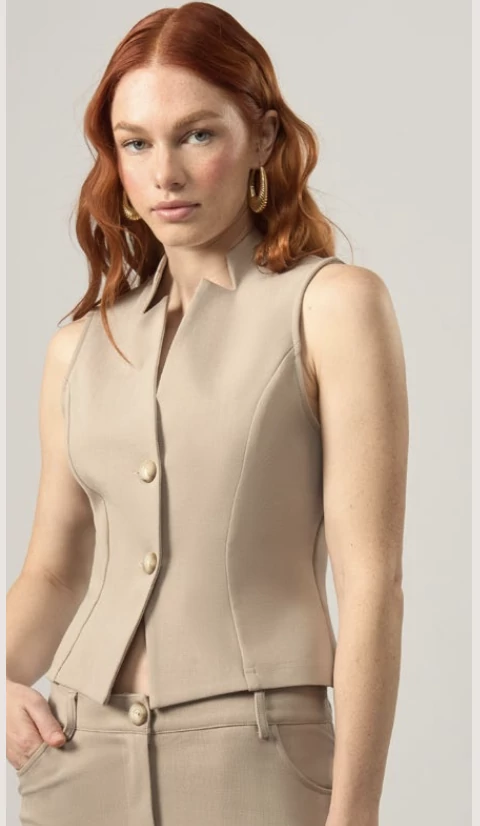 Bézs árnyalatú ujjatlan női mellény elegáns szabásvonallal, amely különleges karaktert ad az irodai és alkalmi szetteknek. Strukturált kialakítása modern, nőies megjelenést biztosít.