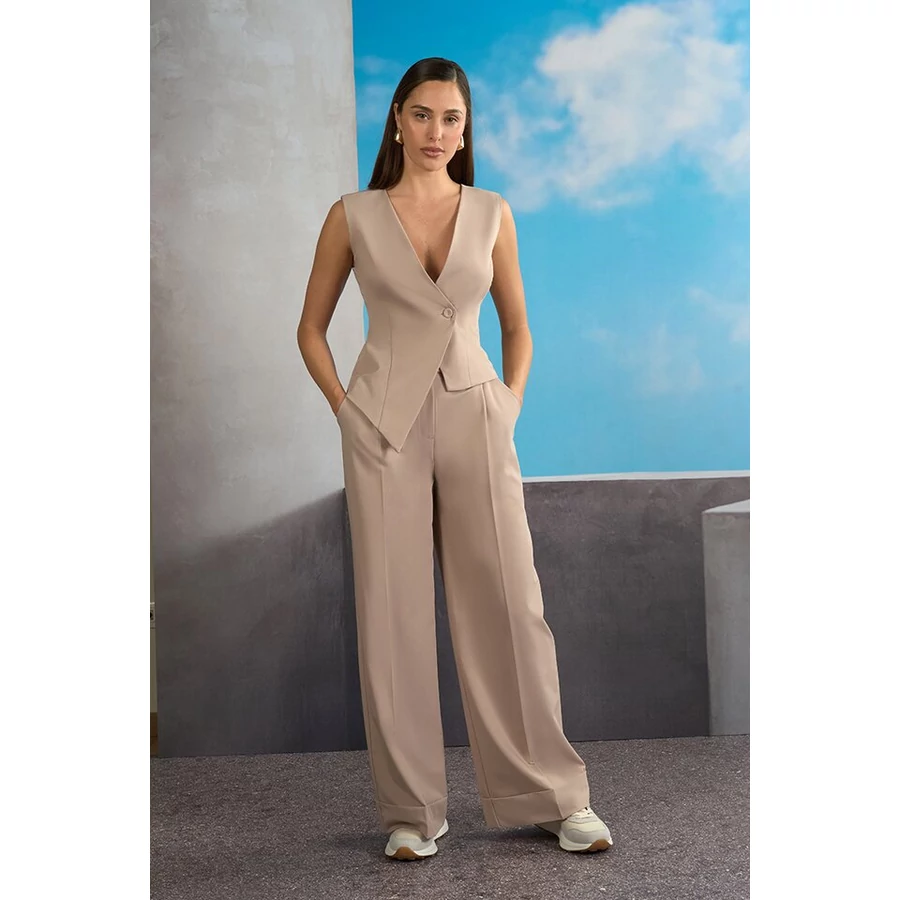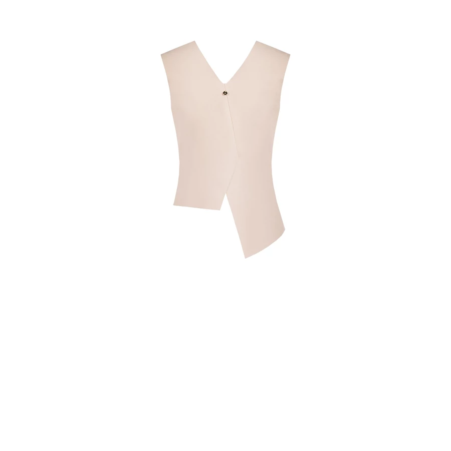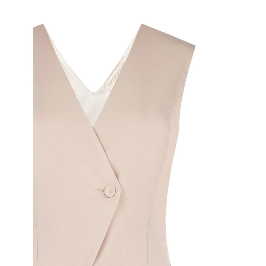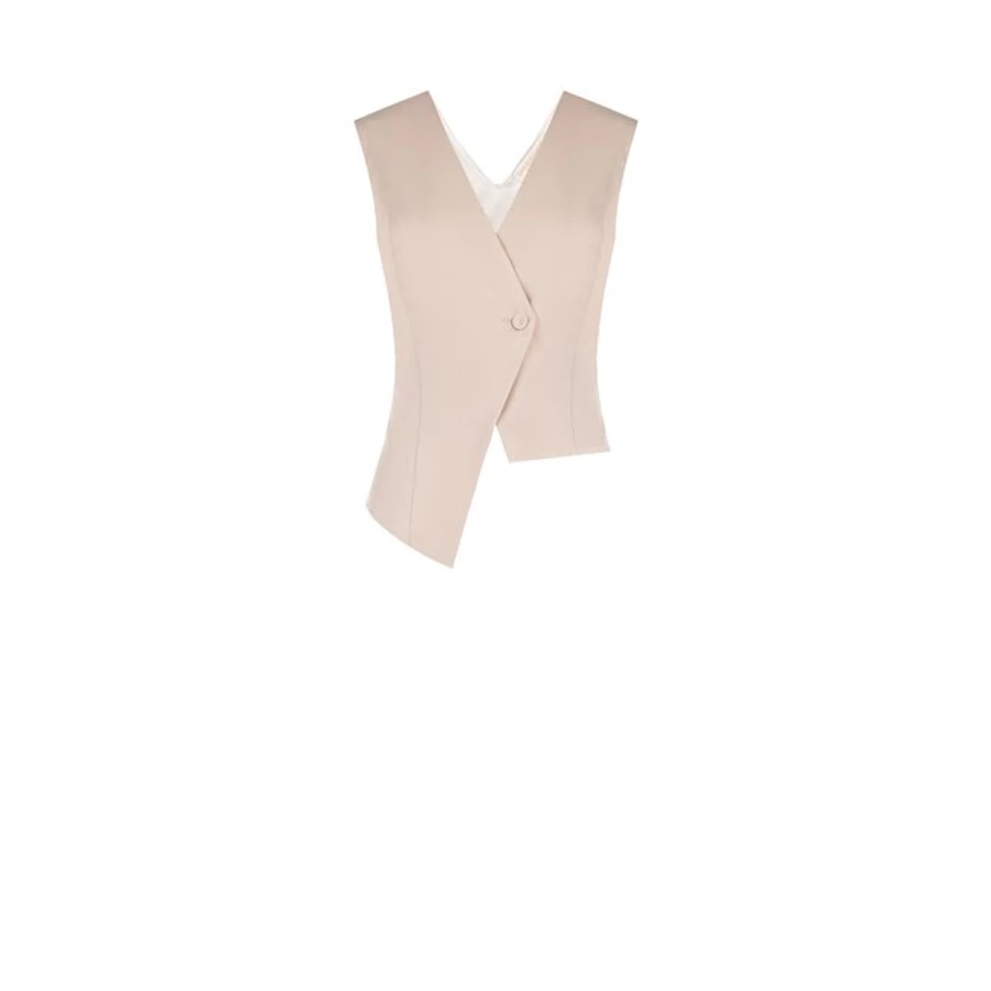 Letisztult bézs ujjatlan női mellény modern, aszimmetrikus szabással, amely stílusos kiegészítője az elegáns és üzleti szetteknek. Különleges fazonja egyedi megjelenést kölcsönöz.