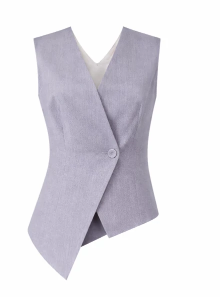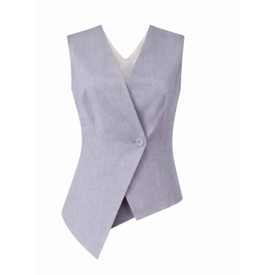 Letisztult szürke ujjatlan női mellény modern, aszimmetrikus szabással, amely stílusos kiegészítője az elegáns és üzleti szetteknek. Különleges fazonja egyedi megjelenést kölcsönöz.