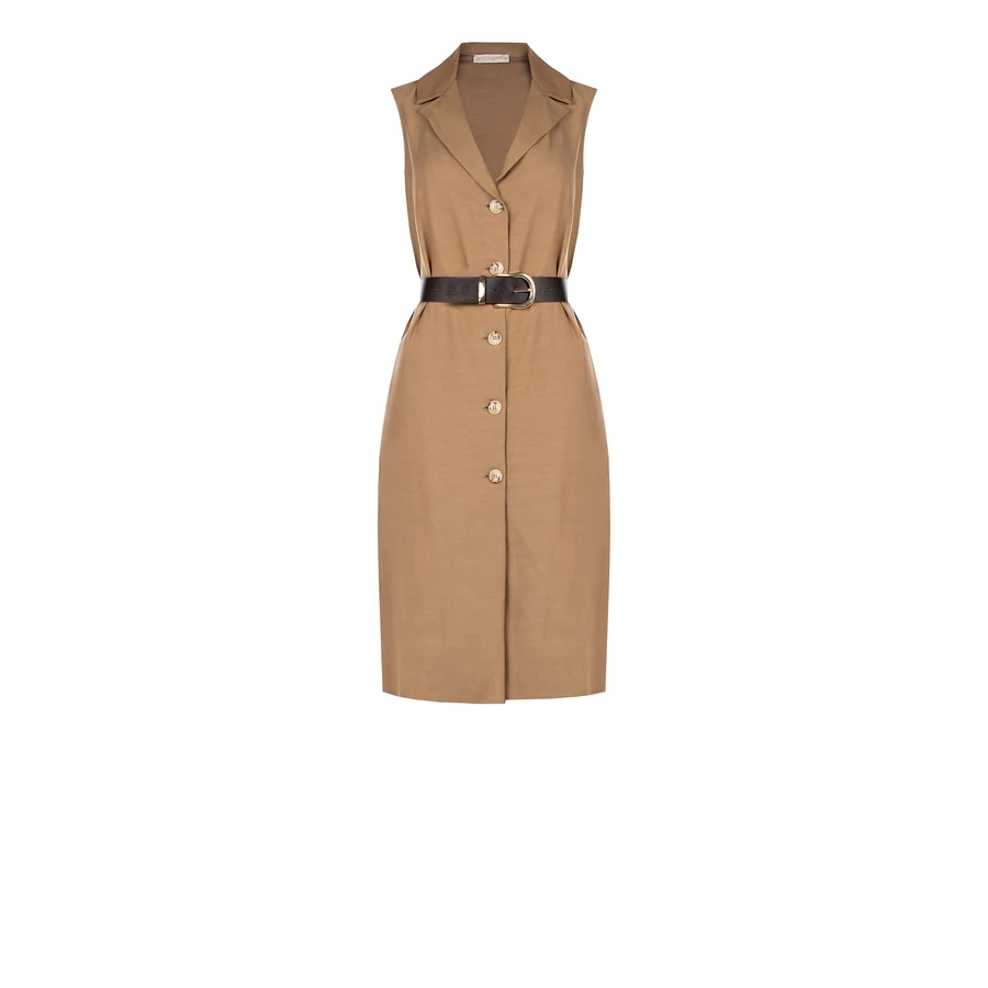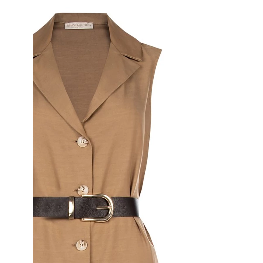 Rinascimento elegáns, ujjatlan midi ruha letisztult vonalaival és öves megoldásával hangsúlyos, nőies sziluettet ad. A gombos kialakítás és a klasszikus gallér időtálló megjelenést biztosít, míg a deréknál elhelyezett öv szépen kiemeli az alakot. Tökéletes választás irodai viselethez vagy alkalmi megjelenéshez is.