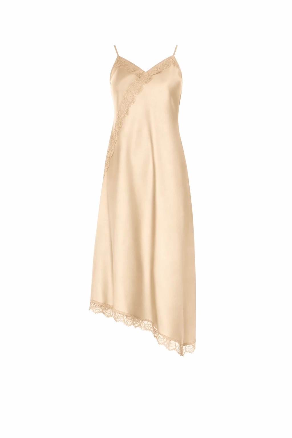 Bézs, spagettipántos selyemhatású ruha csipkeszegéllyel. Légies, nőies fazon, alkalmi vagy esti viselethez. Tökéletes választás irodai viselethez, alkalmi eseményekhez vagy stílusos hétköznapi megjelenéshez.