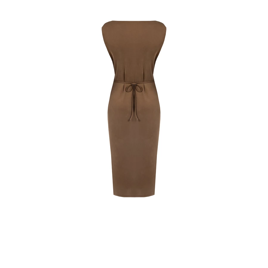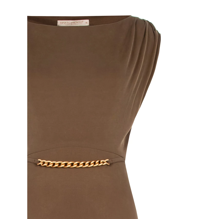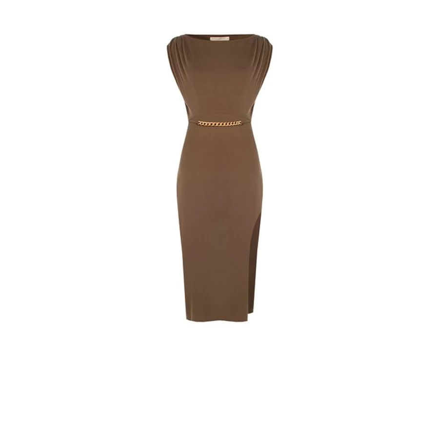 Barna színű, testhezálló midi ruha arany színű lánc övvel. Nőies, elegáns darab alkalmakra vagy esti megjelenéshez. Tökéletes választás irodai viselethez, alkalmi eseményekhez vagy stílusos hétköznapi megjelenéshez.