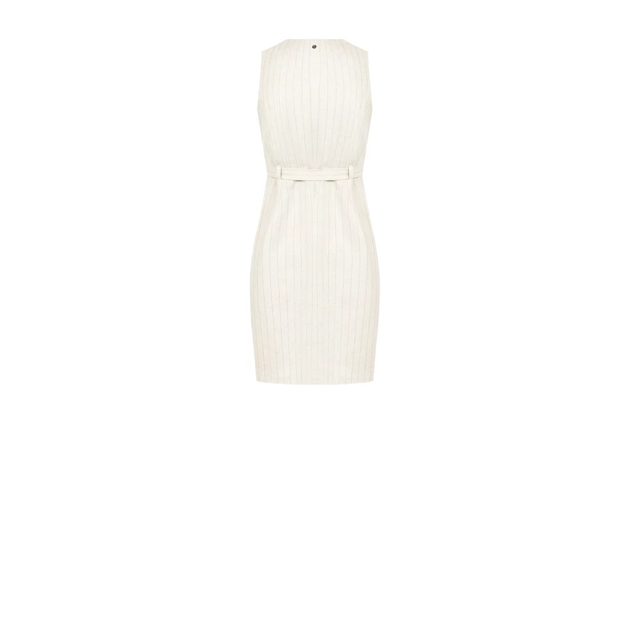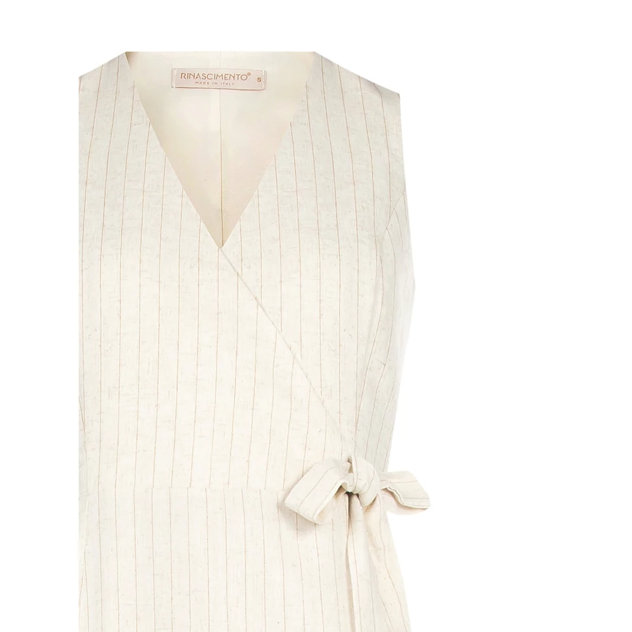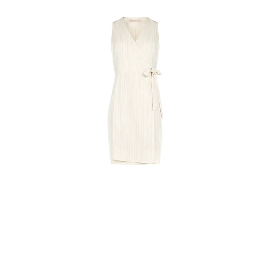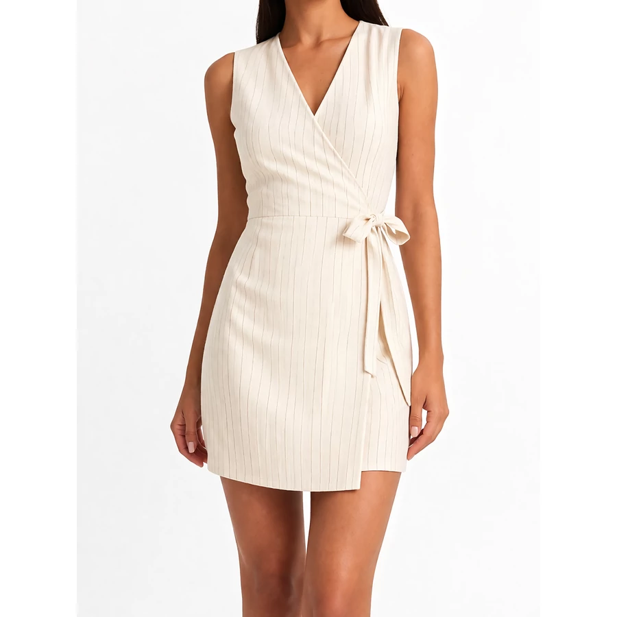 Bézs árnyalatú átlapolt női ruha övvel, amely nőies szabásával és elegáns megjelenésével ideális irodai és alkalmi viselethez. Strukturált anyaga kifinomult hatást kelt.