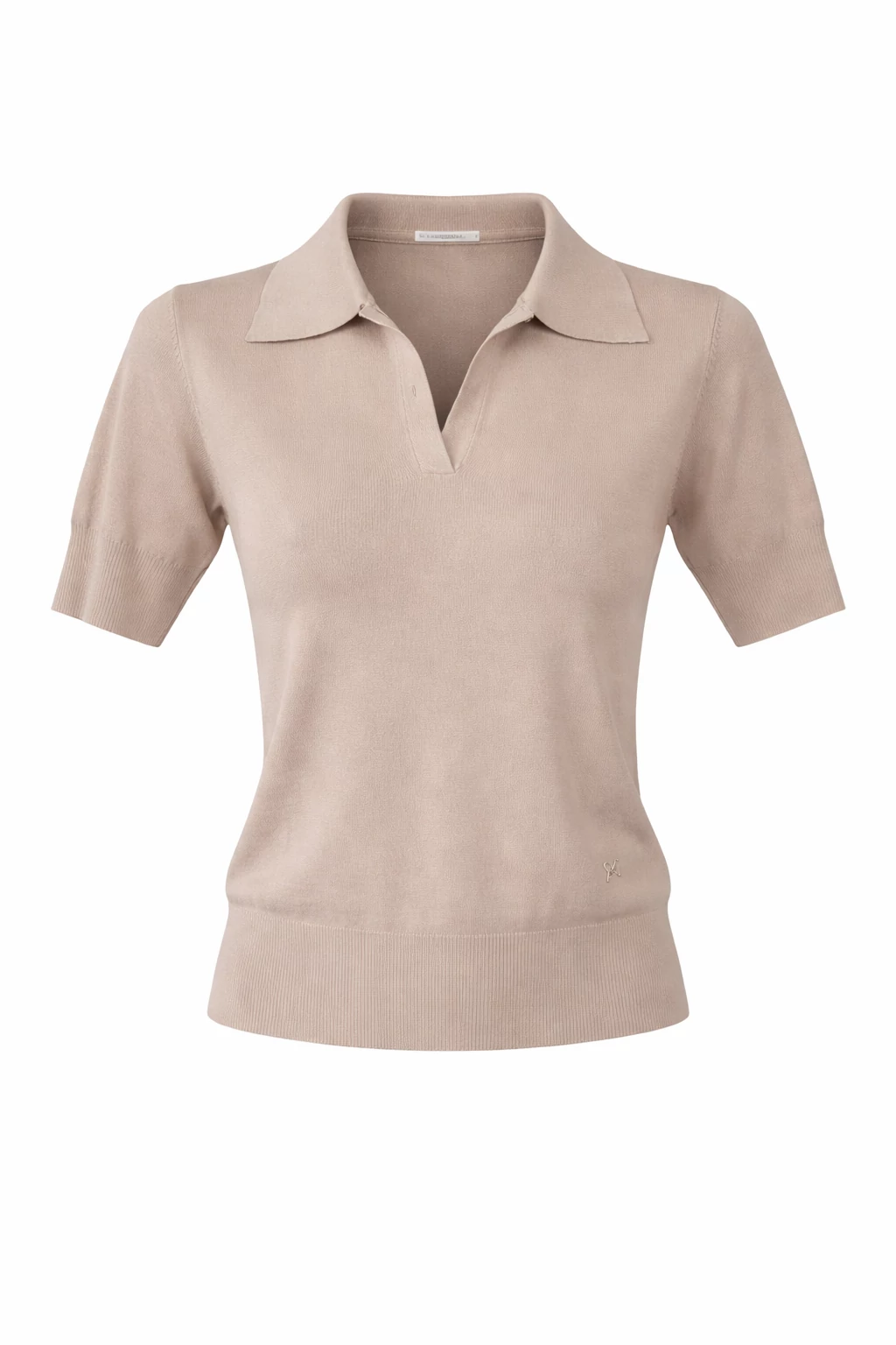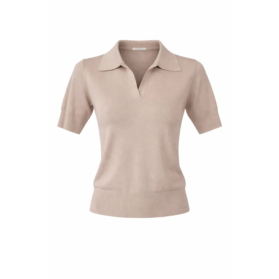 Bézs színű vékonyan kötött galléros póló.