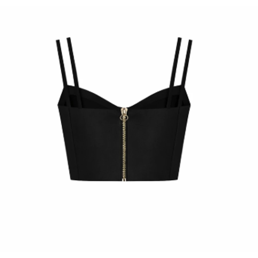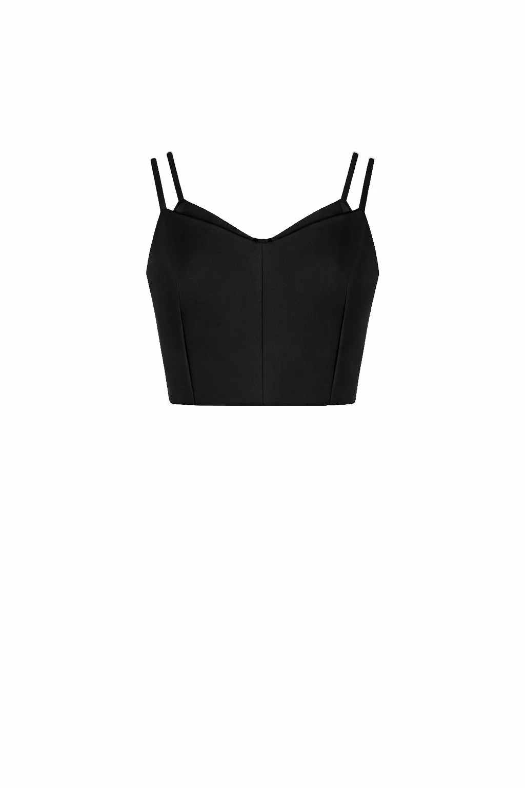 Fekete, pántos crop top, letisztult vonalvezetéssel. Friss, nyári hangulatú darab, amely magas derekú nadrággal vagy szoknyával jól kombinálható. Tökéletes választás irodai viselethez, alkalmi eseményekhez vagy stílusos hétköznapi megjelenéshez.