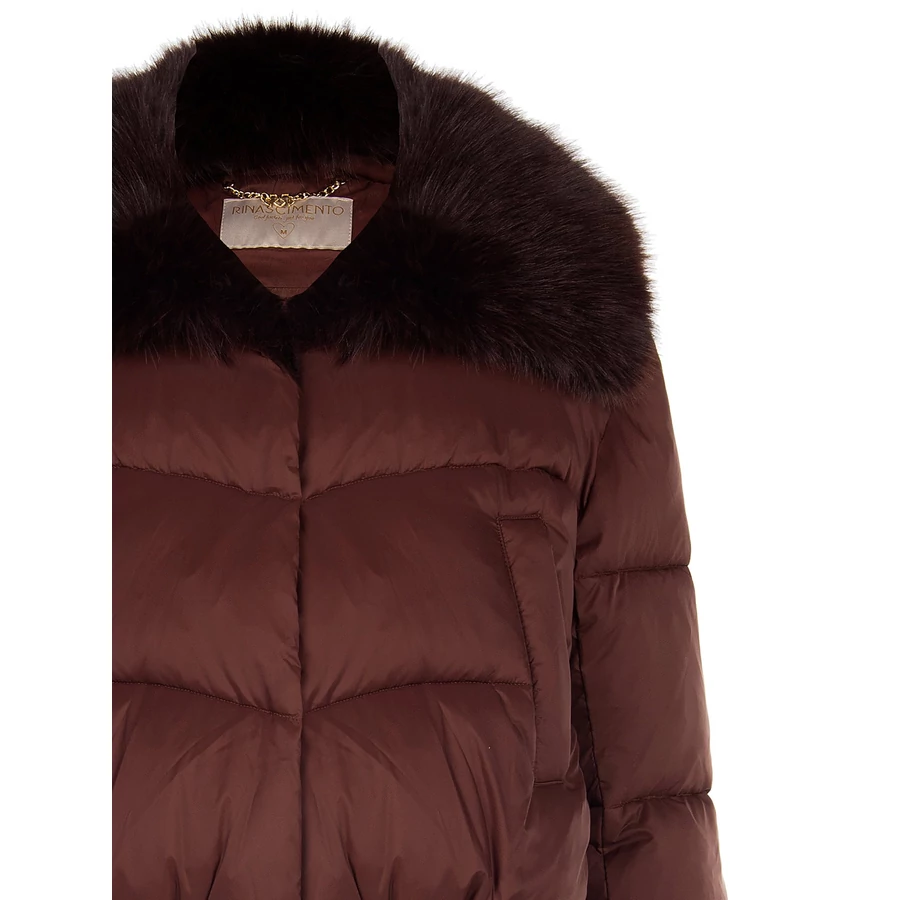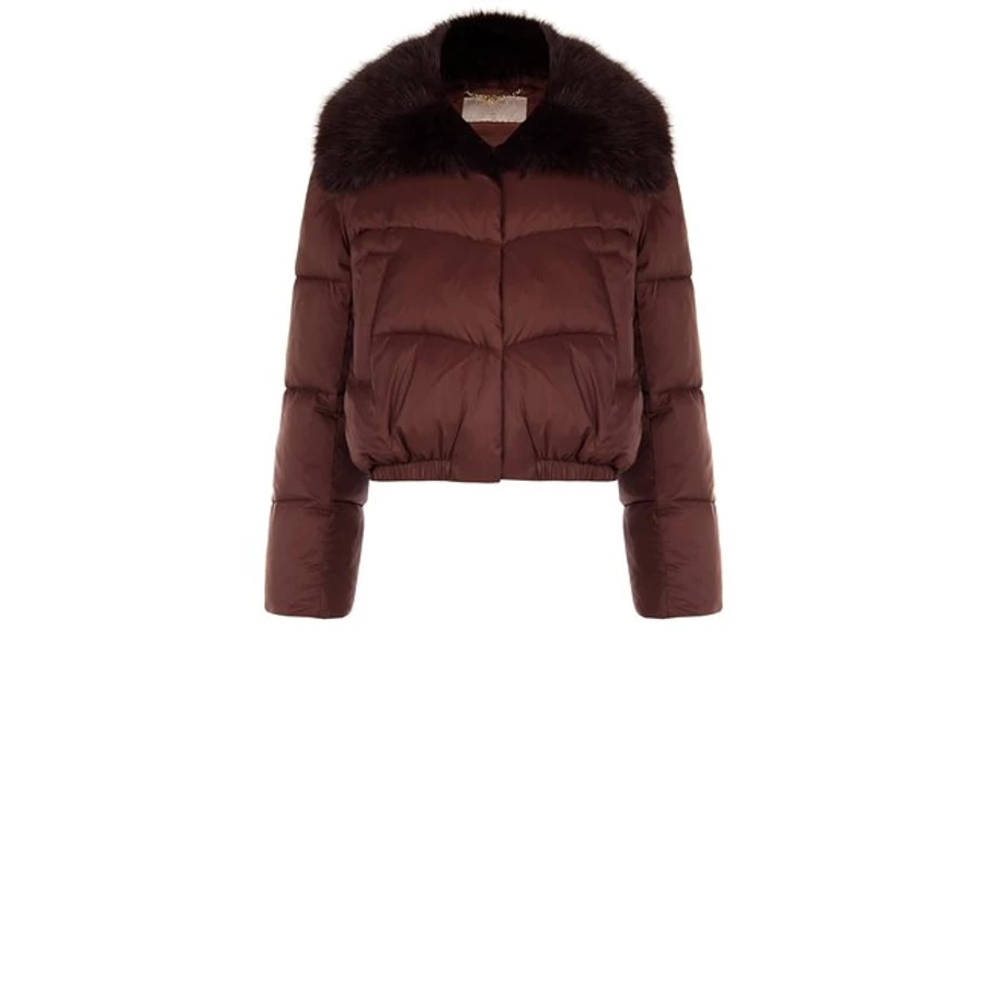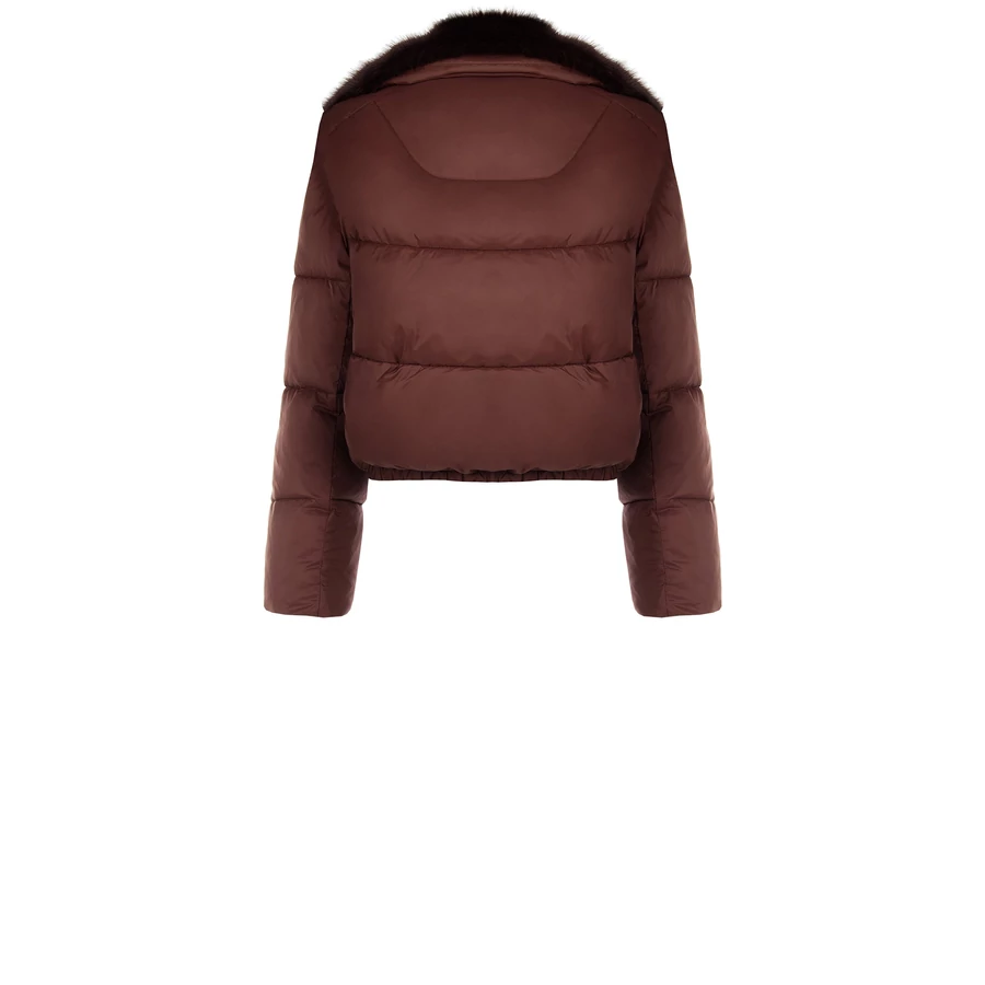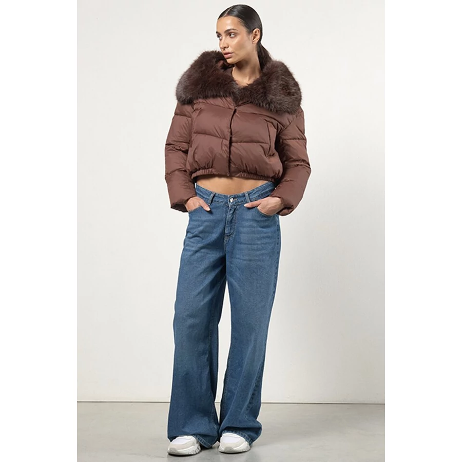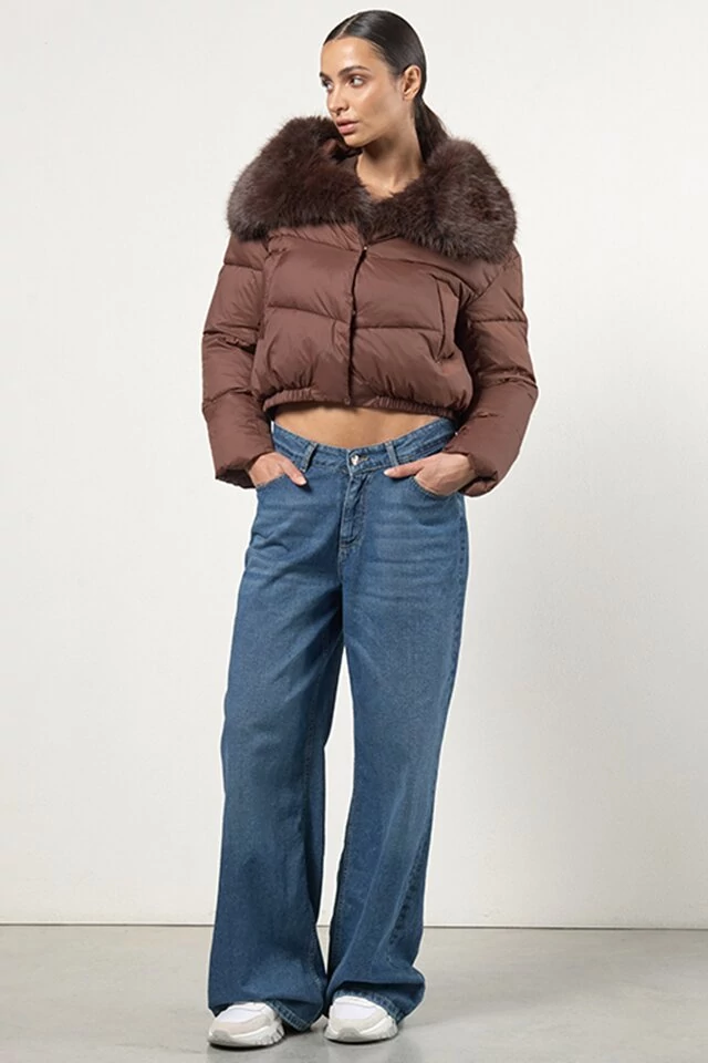 Rövid fazonú barna női télikabát puha szőrmés gallérral, amely trendi és meleg választás a hűvös napokra. Modern szabása tökéletesen illeszkedik a casual városi stílushoz.