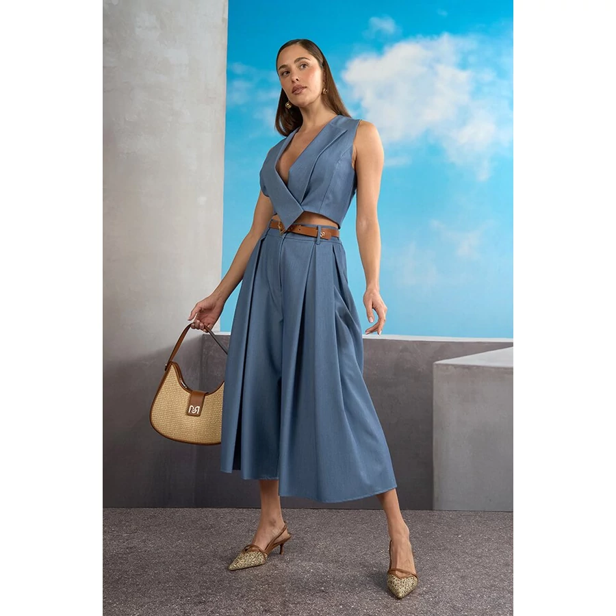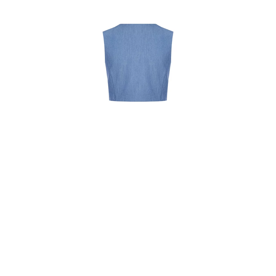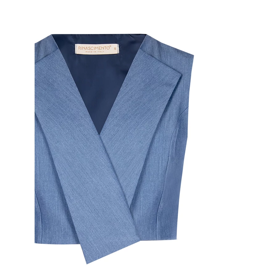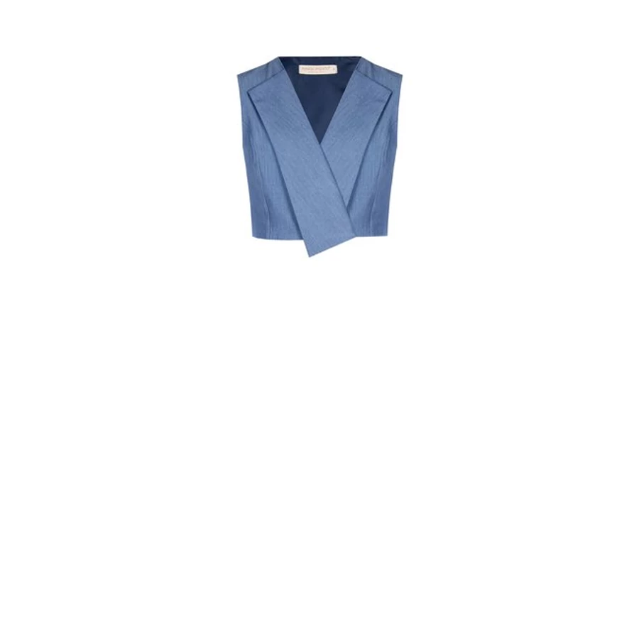 Kék árnyalatú, átlapolós fazonú női mellény. Modern, strukturált darab, amely jól kombinálható elegáns nadrágokkal. Tökéletes választás irodai viselethez, alkalmi eseményekhez vagy stílusos hétköznapi megjelenéshez.