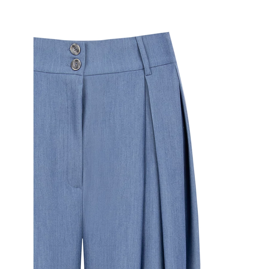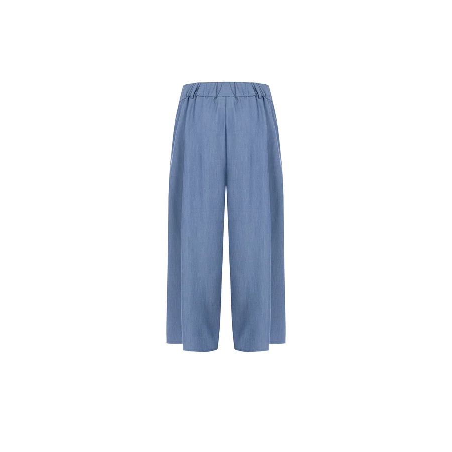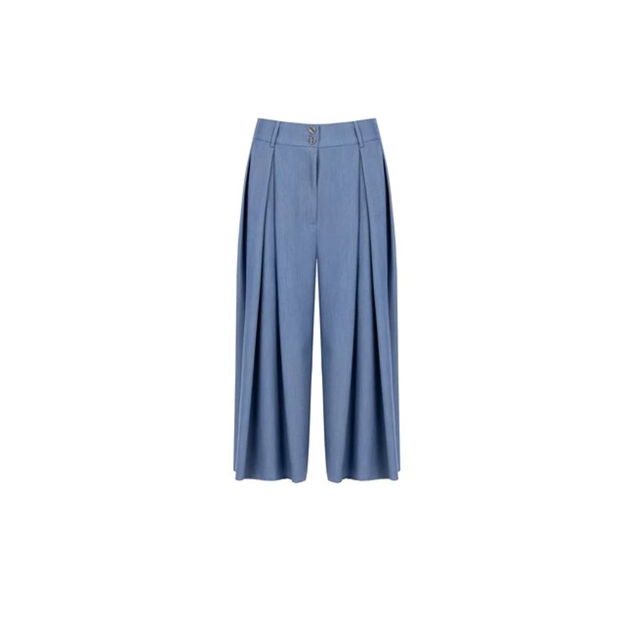 Kék színű, bő szárú, magas derekú női nadrág. Kényelmes és divatos darab hétköznapi vagy irodai viselethez. Tökéletes választás irodai viselethez, alkalmi eseményekhez vagy stílusos hétköznapi megjelenéshez.