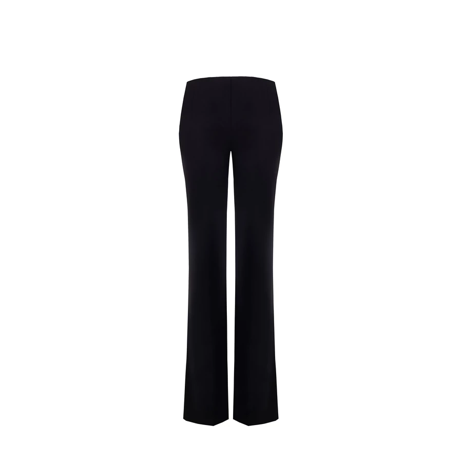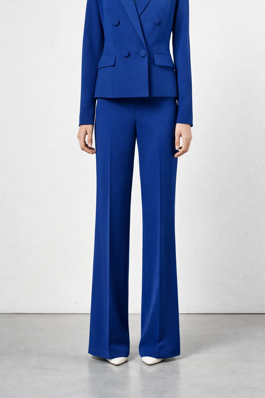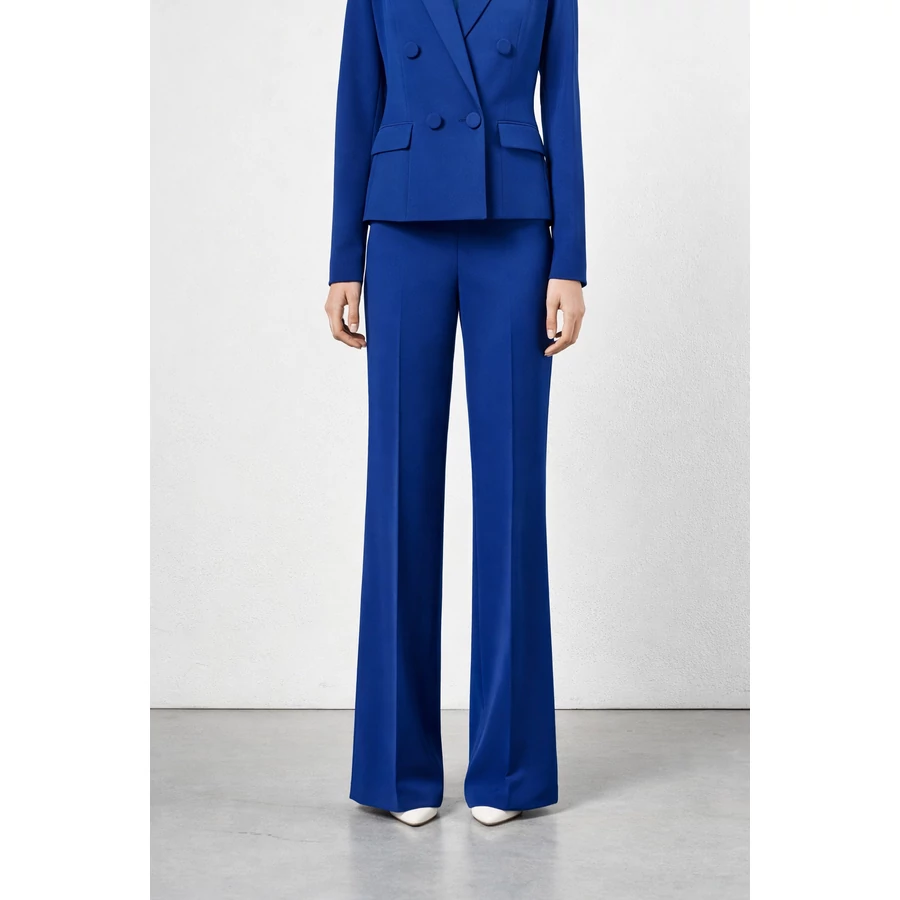 Elegáns söétkék női nadrág kosztümhatású szabással, amely letisztult vonalaival és kényelmes fazonjával ideális irodai és alkalmi viselethez. Időtálló darab, amely könnyen kombinálható blézerrel vagy felsőkkel.