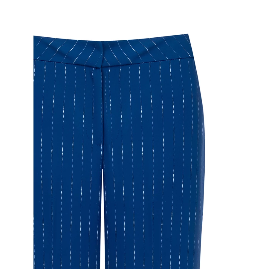 Kék alapon finom csíkozású női nadrág, amely elegáns és trendi megjelenést kínál. Karcsúsító szabása ideális választás üzleti és alkalmi öltözékekhez is.