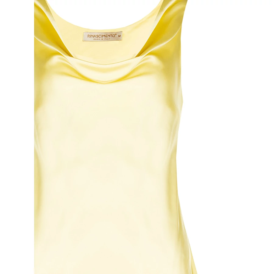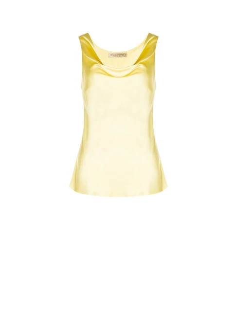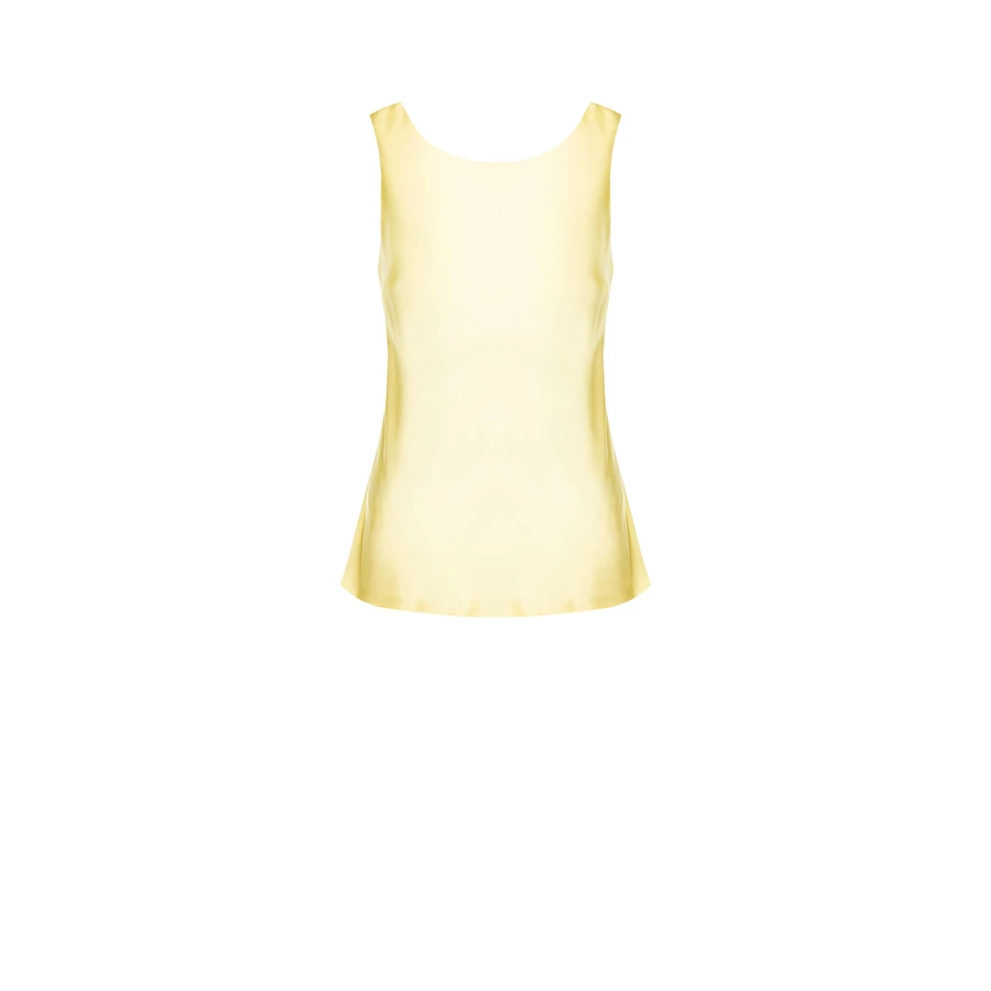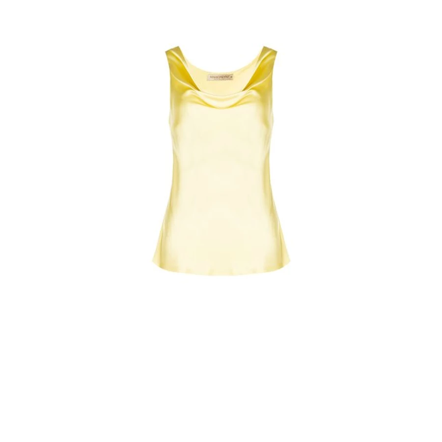 Sárga, ujjatlan női felső selymes hatású anyagból. Könnyed esése és élénk színe miatt tökéletes nyári szettekhez. Tökéletes választás irodai viselethez, alkalmi eseményekhez vagy stílusos hétköznapi megjelenéshez.