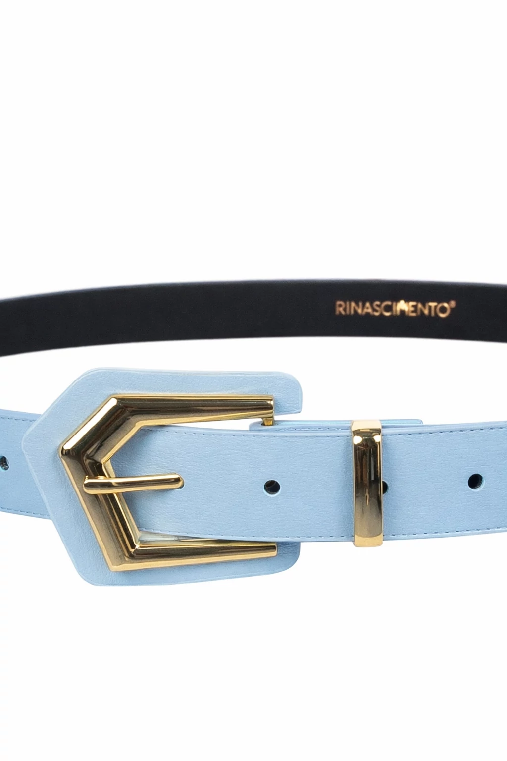 Elegáns vikágoskék női öv arany színű csattal, amely finom kiegészítője a nőies és alkalmi szetteknek. Letisztult kialakítása kiemeli a derekat és harmonikusan illeszkedik világos árnyalatokhoz.