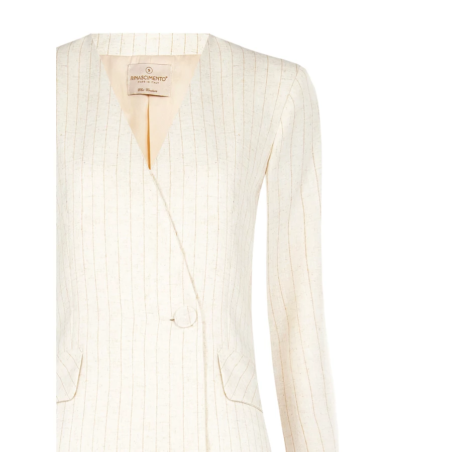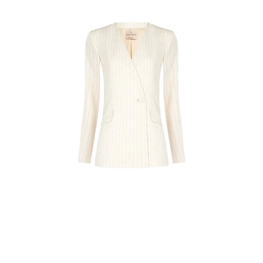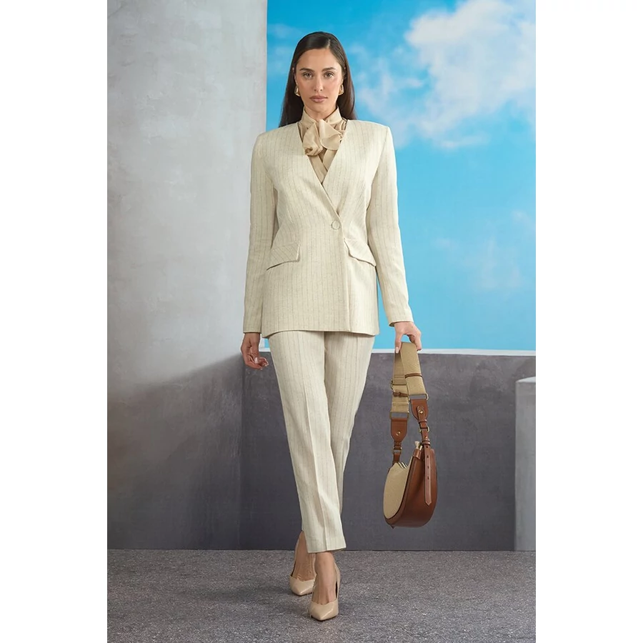 Világos bézs, csíkozott, karcsúsított blézer. Elegáns szabású darab, amely üzleti és alkalmi öltözetekhez is kiváló. Tökéletes választás irodai viselethez, alkalmi eseményekhez vagy stílusos hétköznapi megjelenéshez.